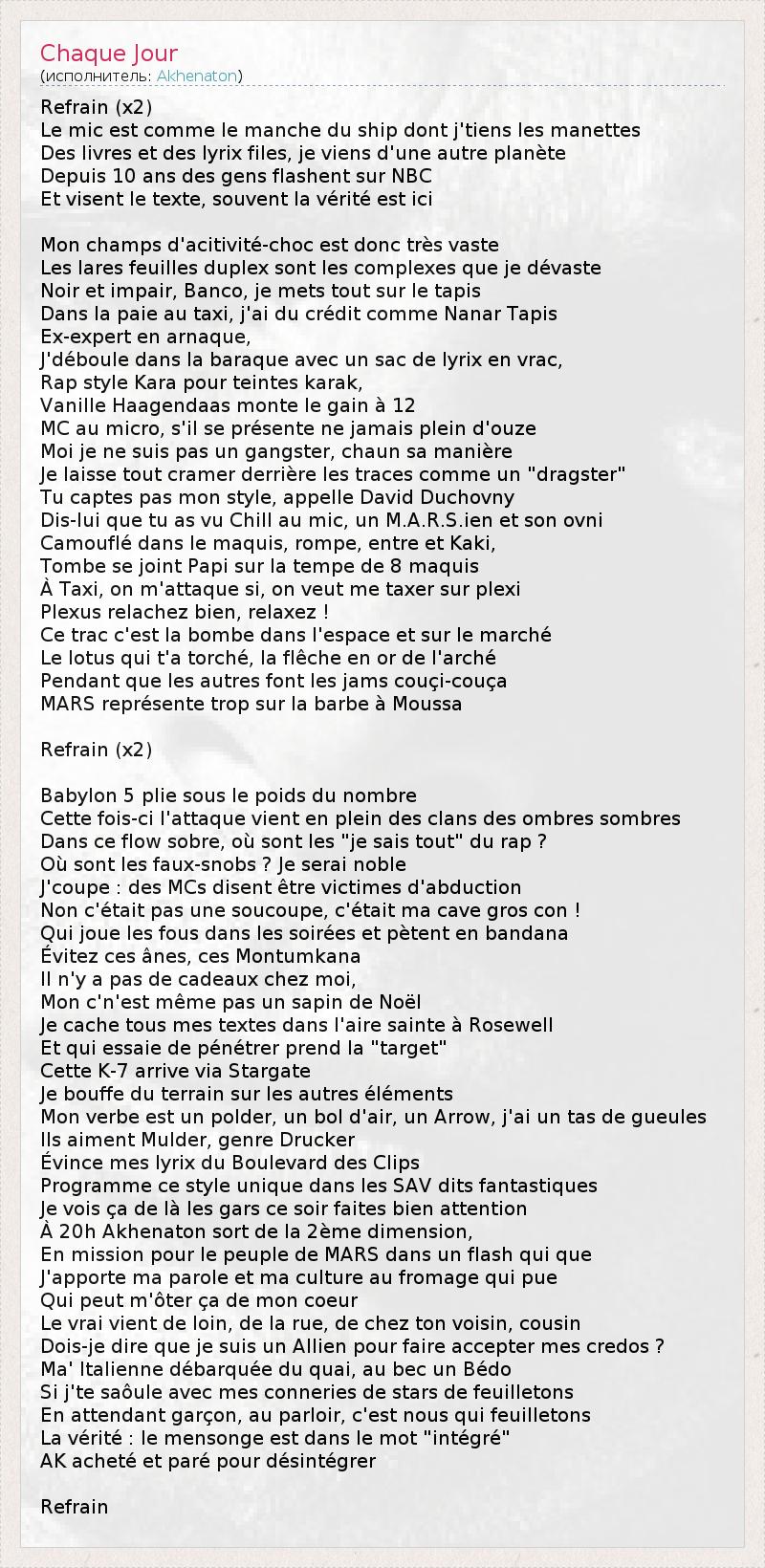 Refrain (x2) Le mic est comme le manche du ship dont j'tiens les manettes Des livres et des lyrix files, je viens d'une autre planète Depuis 10 ans des gens flashent sur NBC Et visent le texte, souvent la vérité est ici Mon champs d'acitivité-choc est donc très vaste Les lares feuilles duplex sont les complexes que je dévaste Noir et impair, Banco, je mets tout sur le tapis Dans la paie au taxi, j'ai du crédit comme Nanar Tapis Ex-expert en arnaque, J'déboule dans la baraque avec un sac de lyrix en vrac, Rap style Kara pour teintes karak, Vanille Haagendaas monte le gain à 12 MC au micro, s'il se présente ne jamais plein d'ouze Moi je ne suis pas un gangster, chaun sa manière Je laisse tout cramer derrière les traces comme un "dragster" Tu captes pas mon style, appelle David Duchovny Dis-lui que tu as vu Chill au mic, un M.A.R.S.ien et son ovni Camouflé dans le maquis, rompe, entre et Kaki, Tombe se joint Papi sur la tempe de 8 maquis À Taxi, on m'attaque si, on veut me taxer sur plexi Plexus relachez bien, relaxez ! Ce trac c'est la bombe dans l'espace et sur le marché Le lotus qui t'a torché, la flêche en or de l'arché Pendant que les autres font les jams couçi-couça MARS représente trop sur la barbe à Moussa Refrain (x2) Babylon 5 plie sous le poids du nombre Cette fois-ci l'attaque vient en plein des clans des ombres sombres Dans ce flow sobre, où sont les "je sais tout" du rap ? Où sont les faux-snobs ? Je serai noble J'coupe : des MCs disent être victimes d'abduction Non c'était pas une soucoupe, c'était ma cave gros con ! Qui joue les fous dans les soirées et pètent en bandana Évitez ces ânes, ces Montumkana Il n'y a pas de cadeaux chez moi, Mon c'n'est même pas un sapin de Noël Je cache tous mes textes dans l'aire sainte à Rosewell Et qui essaie de pénétrer prend la "target" Cette K-7 arrive via Stargate Je bouffe du terrain sur les autres éléments Mon verbe est un polder, un bol d'air, un Arrow, j'ai un tas de gueules Ils aiment Mulder, genre Drucker Évince mes lyrix du Boulevard des Clips Programme ce style unique dans les SAV dits fantastiques Je vois ça de là les gars ce soir faites bien attention À 20h Akhenaton sort de la 2ème dimension, En mission pour le peuple de MARS dans un flash qui que J'apporte ma parole et ma culture au fromage qui pue Qui peut m'ôter ça de mon coeur Le vrai vient de loin, de la rue, de chez ton voisin, cousin Dois-je dire que je suis un Allien pour faire accepter mes credos ? Ma' Italienne débarquée du quai, au bec un Bédo Si j'te saôule avec mes conneries de stars de feuilletons En attendant garçon, au parloir, c'est nous qui feuilletons La vérité : le mensonge est dans le mot "intégré" AK acheté et paré pour désintégrer Refrain