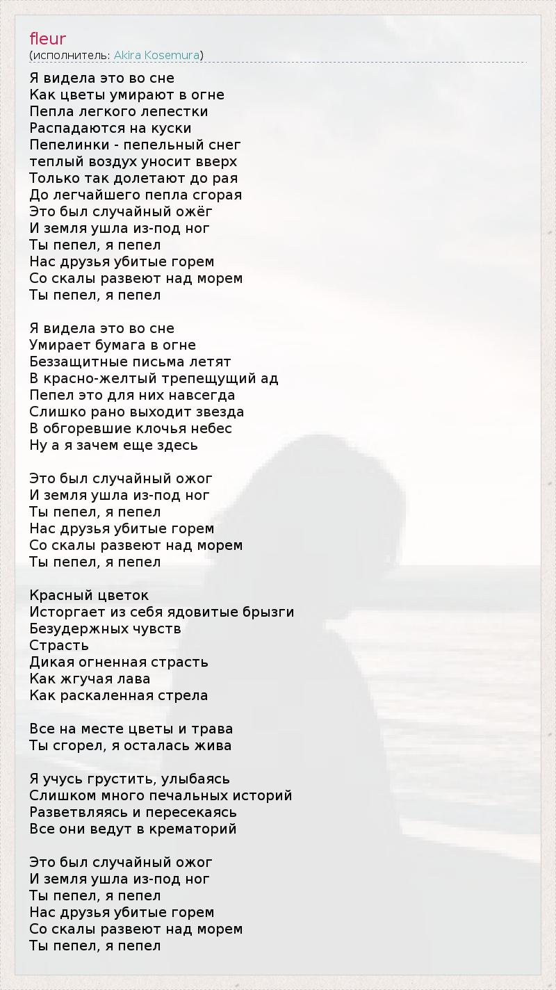 Я видела это во сне Как цветы умирают в огне Пепла легкого лепестки Распадаются на куски Пепелинки - пепельный снег теплый воздух уносит вверх Только так долетают до рая До легчайшего пепла сгорая Это был случайный ожёг И земля ушла из-под ног Ты пепел, я пепел Нас друзья убитые горем Со скалы развеют над морем Ты пепел, я пепел Я видела это во сне Умирает бумага в огне Беззащитные письма летят В красно-желтый трепещущий ад Пепел это для них навсегда Слишко рано выходит звезда В обгоревшие клочья небес Ну а я зачем еще здесь Это был случайный ожог И земля ушла из-под ног Ты пепел, я пепел Нас друзья убитые горем Со скалы развеют над морем Ты пепел, я пепел Красный цветок Исторгает из себя ядовитые брызги Безудержных чувств Страсть Дикая огненная страсть Как жгучая лава Как раскаленная стрела Все на месте цветы и трава Ты сгорел, я осталась жива Я учусь грустить, улыбаясь Слишком много печальных историй Разветвляясь и пересекаясь Все они ведут в крематорий Это был случайный ожог И земля ушла из-под ног Ты пепел, я пепел Нас друзья убитые горем Со скалы развеют над морем Ты пепел, я пепел