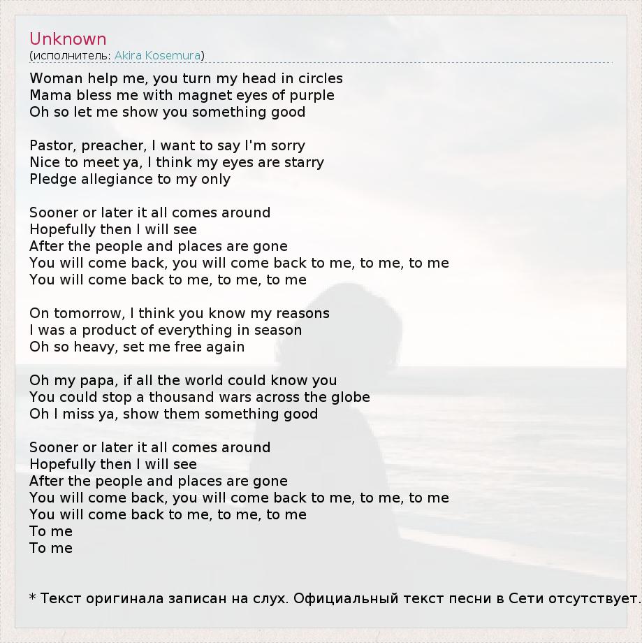 Woman help me, you turn my head in circles Mama bless me with magnet eyes of purple Oh so let me show you something good Pastor, preacher, I want to say I'm sorry Nice to meet ya, I think my eyes are starry Pledge allegiance to my only Sooner or later it all comes around Hopefully then I will see After the people and places are gone You will come back, you will come back to me, to me, to me You will come back to me, to me, to me On tomorrow, I think you know my reasons I was a product of everything in season Oh so heavy, set me free again Oh my papa, if all the world could know you You could stop a thousand wars across the globe Oh I miss ya, show them something good Sooner or later it all comes around Hopefully then I will see After the people and places are gone You will come back, you will come back to me, to me, to me You will come back to me, to me, to me To me To me * Текст оригинала записан на слух. Официальный текст песни в Сети отсутствует.