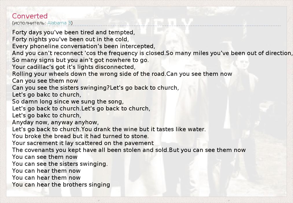 Это интересно:Alabama 3 (A3) – группа, играющая смесь рока, эсид хауса, блюза, кантри и госпела, основанная в пригороде Лондона - Брикстоне, в 1996 году. Своё название группа получила в память ”Алабама 2”, юридического случая на американском юге 30-ых годов, когда два афро-американца были повешены за предположительное изнасилование белой женщины. Это название – такое же поклонение другим жертвам несправедливости,... продолжение
