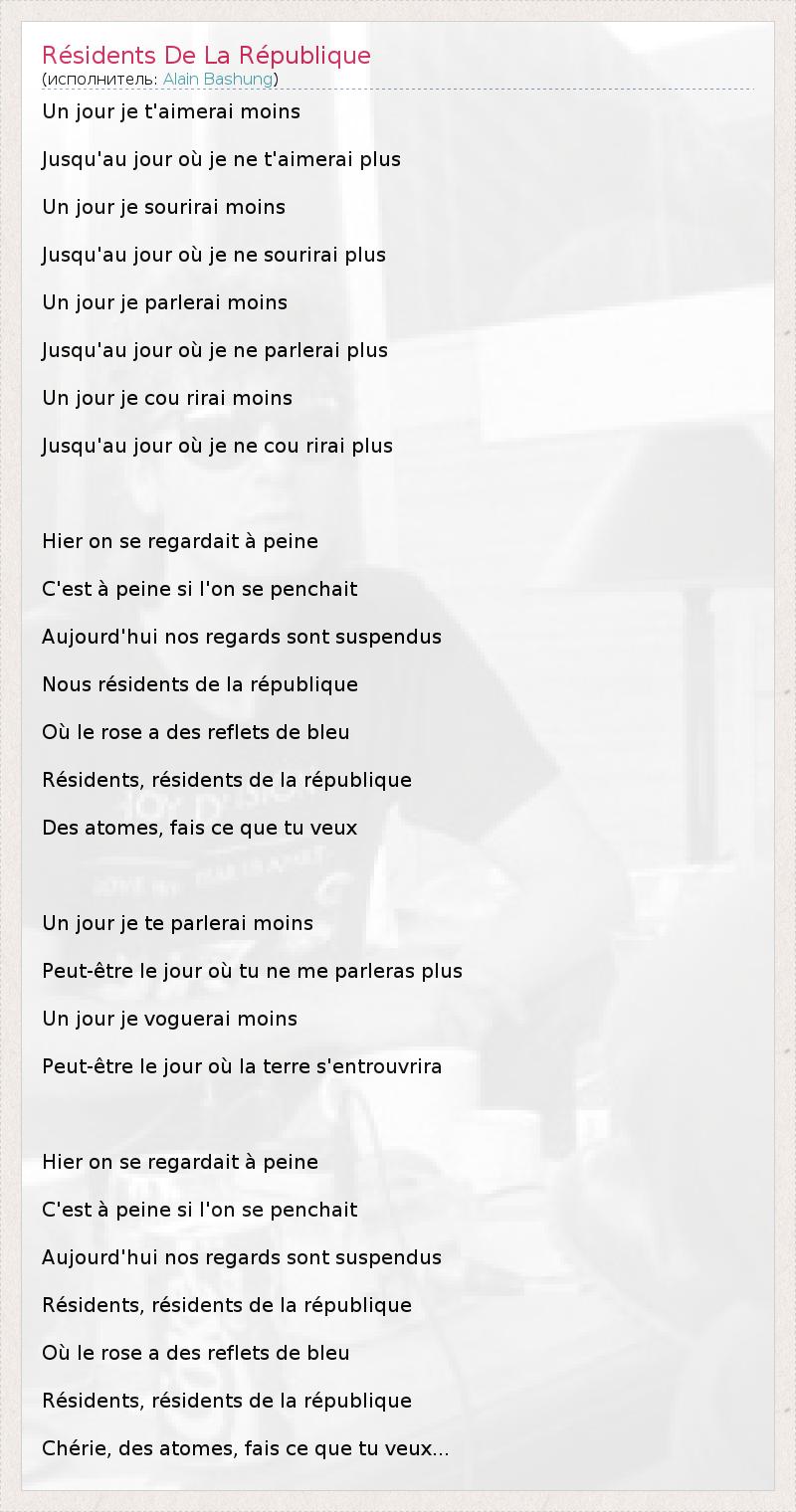 Un jour je t'aimerai moins Jusqu'au jour où je ne t'aimerai plus Un jour je sourirai moins Jusqu'au jour où je ne sourirai plus Un jour je parlerai moins Jusqu'au jour où je ne parlerai plus Un jour je cou rirai moins Jusqu'au jour où je ne cou rirai plus Hier on se regardait à peine C'est à peine si l'on se penchait Aujourd'hui nos regards sont suspendus Nous résidents de la république Où le rose a des reflets de bleu Résidents, résidents de la république Des atomes, fais ce que tu veux Un jour je te parlerai moins Peut-être le jour où tu ne me parleras plus Un jour je voguerai moins Peut-être le jour où la terre s'entrouvrira Hier on se regardait à peine C'est à peine si l'on se penchait Aujourd'hui nos regards sont suspendus Résidents, résidents de la république Où le rose a des reflets de bleu Résidents, résidents de la république Chérie, des atomes, fais ce que tu veux...