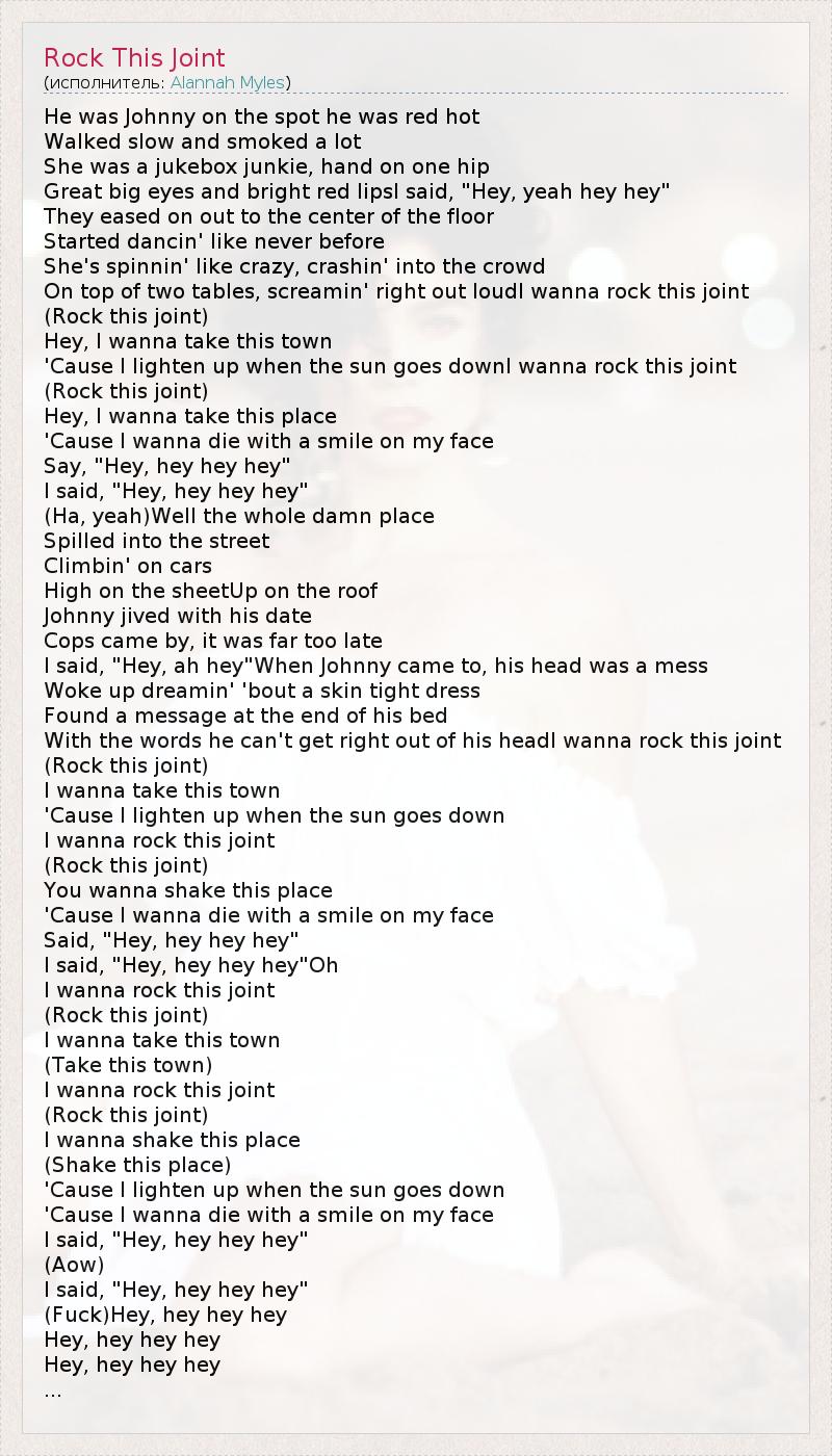 He was Johnny on the spot he was red hot Walked slow and smoked a lot She was a jukebox junkie, hand on one hip Great big eyes and bright red lipsI said, "Hey, yeah hey hey" They eased on out to the center of the floor Started dancin' like never before She's spinnin' like crazy, crashin' into the crowd On top of two tables, screamin' right out loudI wanna rock this joint (Rock this joint) Hey, I wanna take this town 'Cause I lighten up when the sun goes downI wanna rock this joint (Rock this joint) Hey, I wanna take this place 'Cause I wanna die with a smile on my face Say, "Hey, hey hey hey" I said, "Hey, hey hey hey" (Ha, yeah)Well the whole damn place Spilled into the street Climbin' on cars High on the sheetUp on the roof Johnny jived with his date Cops came by, it was far too late I said, "Hey, ah hey"When Johnny came to, his head was a mess Woke up dreamin' 'bout a skin tight dress Found a message at the end of his bed With the words he can't get right out of his headI wanna rock this joint (Rock this joint) I wanna take this town 'Cause I lighten up when the sun goes down I wanna rock this joint (Rock this joint) You wanna shake this place 'Cause I wanna die with a smile on my face Said, "Hey, hey hey hey" I said, "Hey, hey hey hey"Oh I wanna rock this joint (Rock this joint) I wanna take this town (Take this town) I wanna rock this joint (Rock this joint) I wanna shake this place (Shake this place) 'Cause I lighten up when the sun goes down 'Cause I wanna die with a smile on my face I said, "Hey, hey hey hey" (Aow) I said, "Hey, hey hey hey" (Fuck)Hey, hey hey hey Hey, hey hey hey Hey, hey hey hey ...