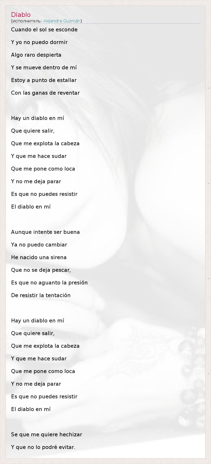 Cuando el sol se esconde Y yo no puedo dormir Algo raro despierta Y se mueve dentro de mí Estoy a punto de estallar Con las ganas de reventar Hay un diablo en mí Que quiere salir, Que me explota la cabeza Y que me hace sudar Que me pone como loca Y no me deja parar Es que no puedes resistir El diablo en mí Aunque intente ser buena Ya no puedo cambiar He nacido una sirena Que no se deja pescar, Es que no aguanto la presión De resistir la tentación Hay un diablo en mí Que quiere salir, Que me explota la cabeza Y que me hace sudar Que me pone como loca Y no me deja parar Es que no puedes resistir El diablo en mí Se que me quiere hechizar Y que no lo podré evitar.