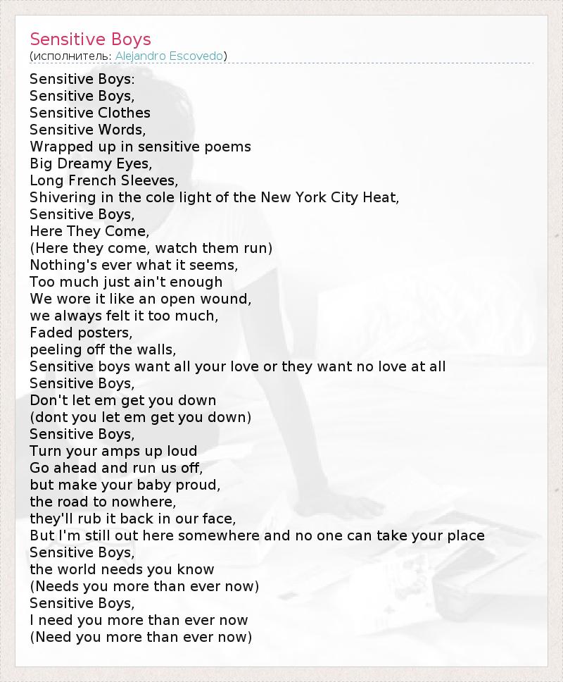 Sensitive Boys: Sensitive Boys, Sensitive Clothes Sensitive Words, Wrapped up in sensitive poems Big Dreamy Eyes, Long French Sleeves, Shivering in the cole light of the New York City Heat, Sensitive Boys, Here They Come, (Here they come, watch them run) Nothing's ever what it seems, Too much just ain't enough We wore it like an open wound, we always felt it too much, Faded posters, peeling off the walls, Sensitive boys want all your love or they want no love at all Sensitive Boys, Don't let em get you down (dont you let em get you down) Sensitive Boys, Turn your amps up loud Go ahead and run us off, but make your baby proud, the road to nowhere, they'll rub it back in our face, But I'm still out here somewhere and no one can take your place Sensitive Boys, the world needs you know (Needs you more than ever now) Sensitive Boys, I need you more than ever now (Need you more than ever now)