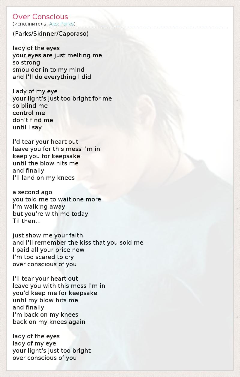 (Parks/Skinner/Caporaso) lady of the eyes your eyes are just melting me so strong smoulder in to my mind and I'll do everything I did Lady of my eye your light's just too bright for me so blind me control me don't find me until I say I'd tear your heart out leave you for this mess I'm in keep you for keepsake until the blow hits me and finally I'll land on my knees a second ago you told me to wait one more I'm walking away but you're with me today Til then... just show me your faith and I'll remember the kiss that you sold me I paid all your price now I'm too scared to cry over conscious of you I'll tear your heart out leave you with this mess I'm in you'd keep me for keepsake until my blow hits me and finally I'm back on my knees back on my knees again lady of the eyes lady of my eye your light's just too bright over conscious of you