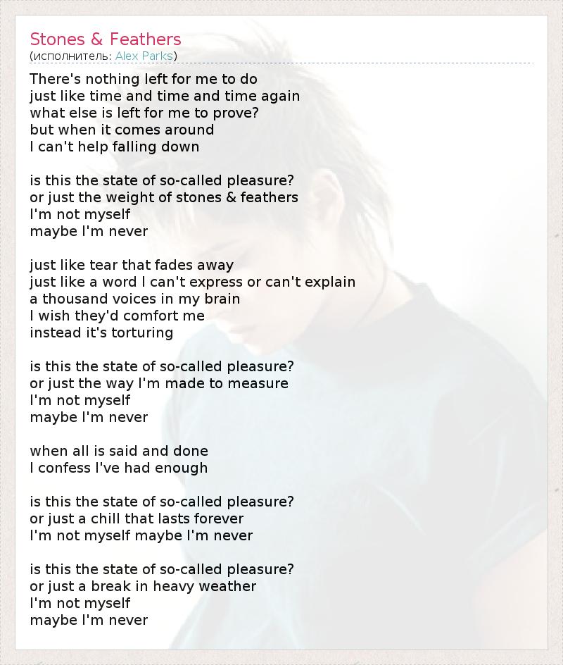 There's nothing left for me to do just like time and time and time again what else is left for me to prove? but when it comes around I can't help falling down is this the state of so-called pleasure? or just the weight of stones & feathers I'm not myself maybe I'm never just like tear that fades away just like a word I can't express or can't explain a thousand voices in my brain I wish they'd comfort me instead it's torturing is this the state of so-called pleasure? or just the way I'm made to measure I'm not myself maybe I'm never when all is said and done I confess I've had enough is this the state of so-called pleasure? or just a chill that lasts forever I'm not myself maybe I'm never is this the state of so-called pleasure? or just a break in heavy weather I'm not myself maybe I'm never