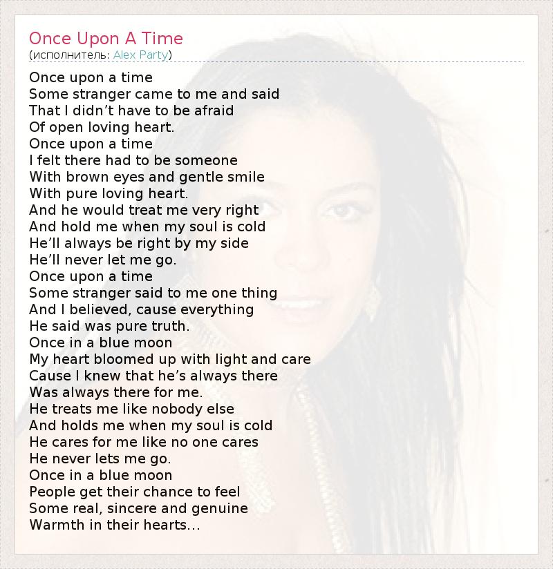 Once upon a time Some stranger came to me and said That I didn’t have to be afraid Of open loving heart. Once upon a time I felt there had to be someone With brown eyes and gentle smile With pure loving heart. And he would treat me very right And hold me when my soul is cold He’ll always be right by my side He’ll never let me go. Once upon a time Some stranger said to me one thing And I believed, cause everything He said was pure truth. Once in a blue moon My heart bloomed up with light and care Cause I knew that he’s always there Was always there for me. He treats me like nobody else And holds me when my soul is cold He cares for me like no one cares He never lets me go. Once in a blue moon People get their chance to feel Some real, sincere and genuine Warmth in their hearts…
