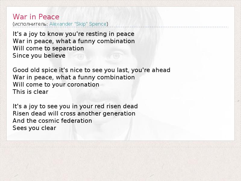 Это интересно:Поэт Alexander Lee "Skip" Spence (18 апреля 1946 – 16 апреля 1999) был ударником группы Jefferson Airplane, гитаристом Quicksilver Messenger Service и одним из создателей группы Moby Grape. Его песня "Omaha" с первой пластинки Moby Grape в 2008 году по высокоавторитетному мнению Rolling Stone Magazine вошла в сотню выдающихся гитарных песен всех времен. До того как заболеть шизофренией и стать наркоманом, он смог записать в 1969 году альбом «Oar».... продолжение