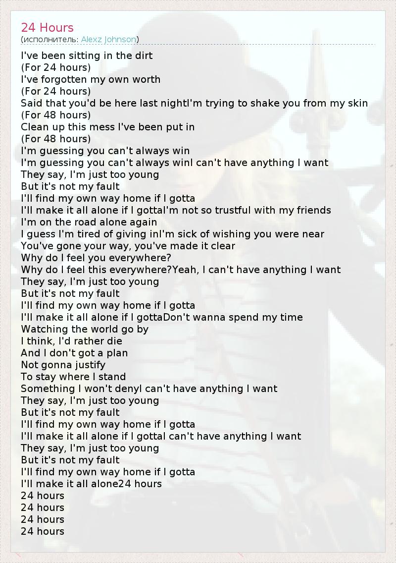 I've been sitting in the dirt (For 24 hours) I've forgotten my own worth (For 24 hours) Said that you'd be here last nightI'm trying to shake you from my skin (For 48 hours) Clean up this mess I've been put in (For 48 hours) I'm guessing you can't always win I'm guessing you can't always winI can't have anything I want They say, I'm just too young But it's not my fault I'll find my own way home if I gotta I'll make it all alone if I gottaI'm not so trustful with my friends I'm on the road alone again I guess I'm tired of giving inI'm sick of wishing you were near You've gone your way, you've made it clear Why do I feel you everywhere? Why do I feel this everywhere?Yeah, I can't have anything I want They say, I'm just too young But it's not my fault I'll find my own way home if I gotta I'll make it all alone if I gottaDon't wanna spend my time Watching the world go by I think, I'd rather die And I don't got a plan Not gonna justify To stay where I stand Something I won't denyI can't have anything I want They say, I'm just too young But it's not my fault I'll find my own way home if I gotta I'll make it all alone if I gottaI can't have anything I want They say, I'm just too young But it's not my fault I'll find my own way home if I gotta I'll make it all alone24 hours 24 hours 24 hours 24 hours 24 hours