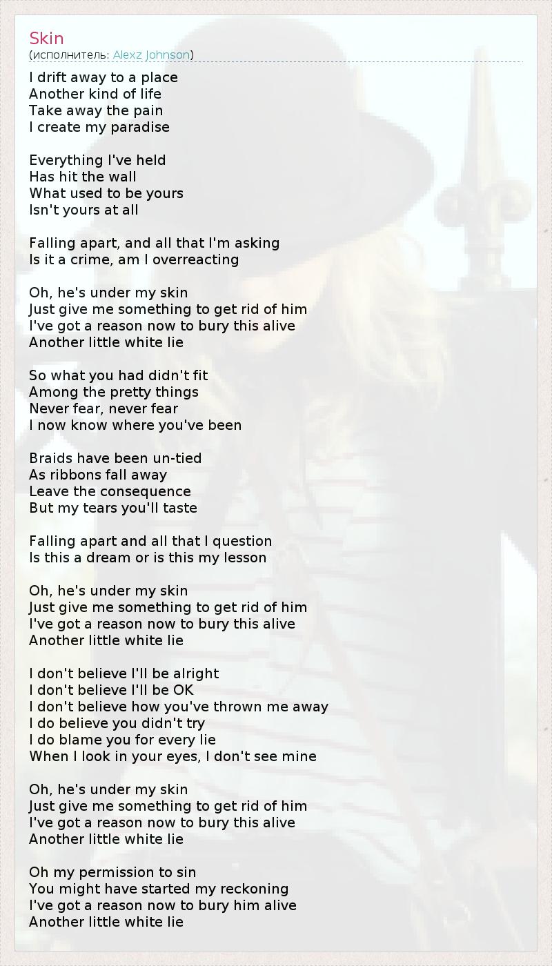 I drift away to a place Another kind of life Take away the pain I create my paradise Everything I've held Has hit the wall What used to be yours Isn't yours at all Falling apart, and all that I'm asking Is it a crime, am I overreacting Oh, he's under my skin Just give me something to get rid of him I've got a reason now to bury this alive Another little white lie So what you had didn't fit Among the pretty things Never fear, never fear I now know where you've been Braids have been un-tied As ribbons fall away Leave the consequence But my tears you'll taste Falling apart and all that I question Is this a dream or is this my lesson Oh, he's under my skin Just give me something to get rid of him I've got a reason now to bury this alive Another little white lie I don't believe I'll be alright I don't believe I'll be OK I don't believe how you've thrown me away I do believe you didn't try I do blame you for every lie When I look in your eyes, I don't see mine Oh, he's under my skin Just give me something to get rid of him I've got a reason now to bury this alive Another little white lie Oh my permission to sin You might have started my reckoning I've got a reason now to bury him alive Another little white lie