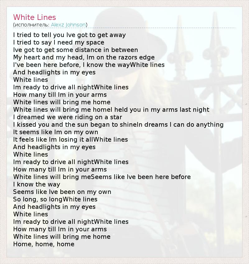 I tried to tell you Ive got to get away I tried to say I need my space Ive got to get some distance in between My heart and my head, Im on the razors edge I've been here before, I know the wayWhite lines And headlights in my eyes White lines Im ready to drive all nightWhite lines How many till Im in your arms White lines will bring me home White lines will bring me homeI held you in my arms last night I dreamed we were riding on a star I kissed you and the sun began to shineIn dreams I can do anything It seems like Im on my own It feels like Im losing it allWhite lines And headlights in my eyes White lines Im ready to drive all nightWhite lines How many till Im in your arms White lines will bring meSeems like Ive been here before I know the way Seems like Ive been on my own So long, so longWhite lines And headlights in my eyes White lines Im ready to drive all nightWhite lines How many till Im in your arms White lines will bring me home Home, home, home