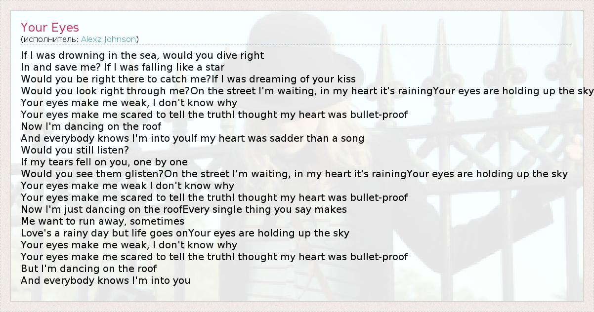 If I was drowning in the sea, would you dive right In and save me? If I was falling like a star Would you be right there to catch me?If I was dreaming of your kiss Would you look right through me?On the street I'm waiting, in my heart it's rainingYour eyes are holding up the sky Your eyes make me weak, I don't know why Your eyes make me scared to tell the truthI thought my heart was bullet-proof Now I'm dancing on the roof And everybody knows I'm into youIf my heart was sadder than a song Would you still listen? If my tears fell on you, one by one Would you see them glisten?On the street I'm waiting, in my heart it's rainingYour eyes are holding up the sky Your eyes make me weak I don't know why Your eyes make me scared to tell the truthI thought my heart was bullet-proof Now I'm just dancing on the roofEvery single thing you say makes Me want to run away, sometimes Love's a rainy day but life goes onYour eyes are holding up the sky Your eyes make me weak, I don't know why Your eyes make me scared to tell the truthI thought my heart was bullet-proof But I'm dancing on the roof And everybody knows I'm into you