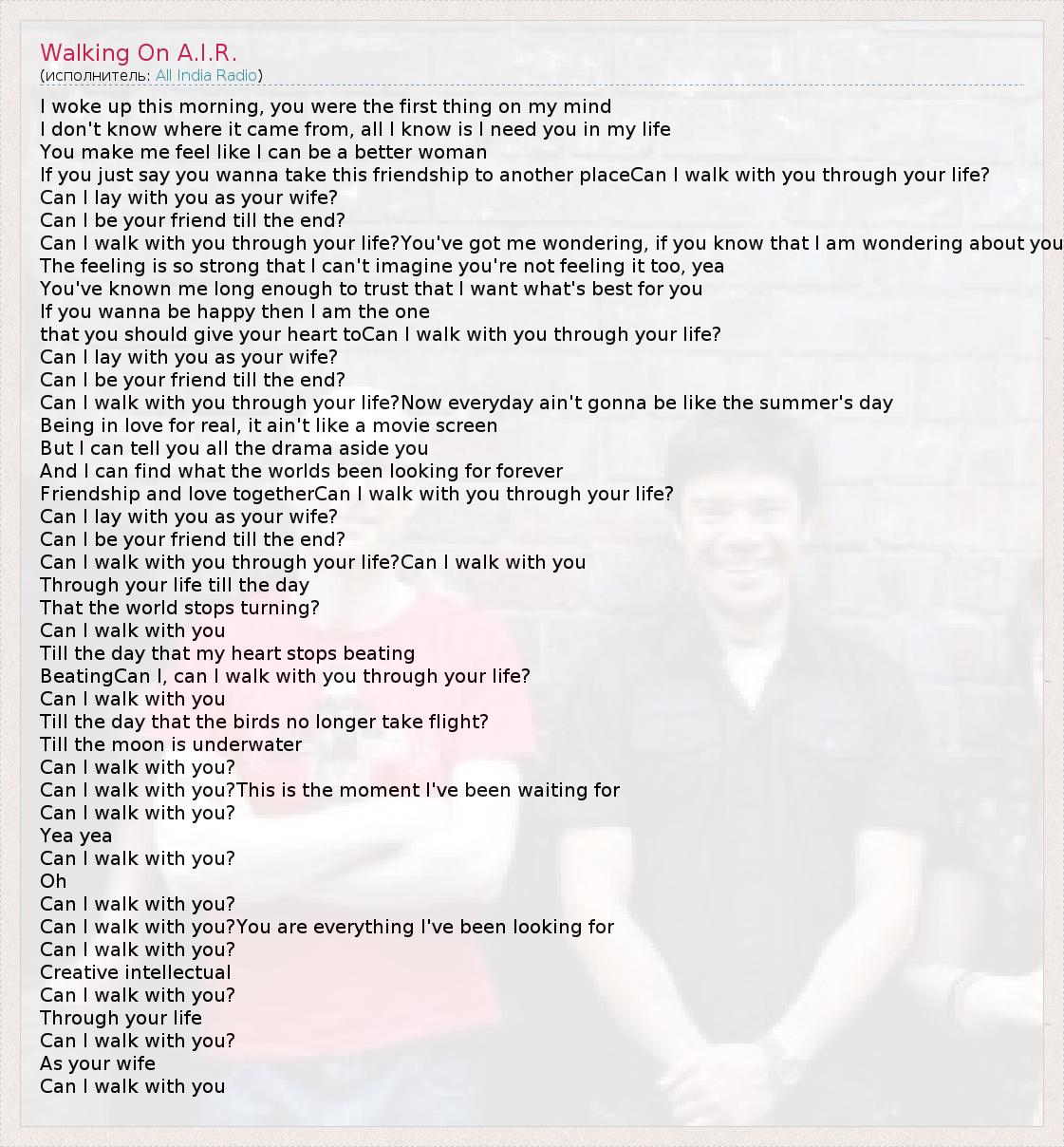 I woke up this morning, you were the first thing on my mind I don't know where it came from, all I know is I need you in my life You make me feel like I can be a better woman If you just say you wanna take this friendship to another placeCan I walk with you through your life? Can I lay with you as your wife? Can I be your friend till the end? Can I walk with you through your life?You've got me wondering, if you know that I am wondering about you The feeling is so strong that I can't imagine you're not feeling it too, yea You've known me long enough to trust that I want what's best for you If you wanna be happy then I am the one that you should give your heart toCan I walk with you through your life? Can I lay with you as your wife? Can I be your friend till the end? Can I walk with you through your life?Now everyday ain't gonna be like the summer's day Being in love for real, it ain't like a movie screen But I can tell you all the drama aside you And I can find what the worlds been looking for forever Friendship and love togetherCan I walk with you through your life? Can I lay with you as your wife? Can I be your friend till the end? Can I walk with you through your life?Can I walk with you Through your life till the day That the world stops turning? Can I walk with you Till the day that my heart stops beating BeatingCan I, can I walk with you through your life? Can I walk with you Till the day that the birds no longer take flight? Till the moon is underwater Can I walk with you? Can I walk with you?This is the moment I've been waiting for Can I walk with you? Yea yea Can I walk with you? Oh Can I walk with you? Can I walk with you?You are everything I've been looking for Can I walk with you? Creative intellectual Can I walk with you? Through your life Can I walk with you? As your wife Can I walk with you