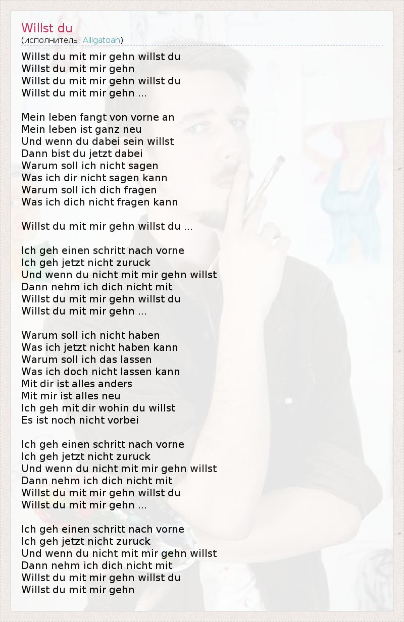 Willst du mit mir gehn willst du Willst du mit mir gehn Willst du mit mir gehn willst du Willst du mit mir gehn ... Mein leben fangt von vorne an Mein leben ist ganz neu Und wenn du dabei sein willst Dann bist du jetzt dabei Warum soll ich nicht sagen Was ich dir nicht sagen kann Warum soll ich dich fragen Was ich dich nicht fragen kann Willst du mit mir gehn willst du ... Ich geh einen schritt nach vorne Ich geh jetzt nicht zuruck Und wenn du nicht mit mir gehn willst Dann nehm ich dich nicht mit Willst du mit mir gehn willst du Willst du mit mir gehn ... Warum soll ich nicht haben Was ich jetzt nicht haben kann Warum soll ich das lassen Was ich doch nicht lassen kann Mit dir ist alles anders Mit mir ist alles neu Ich geh mit dir wohin du willst Es ist noch nicht vorbei Ich geh einen schritt nach vorne Ich geh jetzt nicht zuruck Und wenn du nicht mit mir gehn willst Dann nehm ich dich nicht mit Willst du mit mir gehn willst du Willst du mit mir gehn ... Ich geh einen schritt nach vorne Ich geh jetzt nicht zuruck Und wenn du nicht mit mir gehn willst Dann nehm ich dich nicht mit Willst du mit mir gehn willst du Willst du mit mir gehn