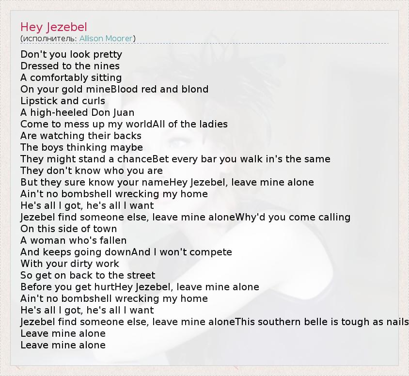 Don't you look pretty Dressed to the nines A comfortably sitting On your gold mineBlood red and blond Lipstick and curls A high-heeled Don Juan Come to mess up my worldAll of the ladies Are watching their backs The boys thinking maybe They might stand a chanceBet every bar you walk in's the same They don't know who you are But they sure know your nameHey Jezebel, leave mine alone Ain't no bombshell wrecking my home He's all I got, he's all I want Jezebel find someone else, leave mine aloneWhy'd you come calling On this side of town A woman who's fallen And keeps going downAnd I won't compete With your dirty work So get on back to the street Before you get hurtHey Jezebel, leave mine alone Ain't no bombshell wrecking my home He's all I got, he's all I want Jezebel find someone else, leave mine aloneThis southern belle is tough as nails Leave mine alone Leave mine alone