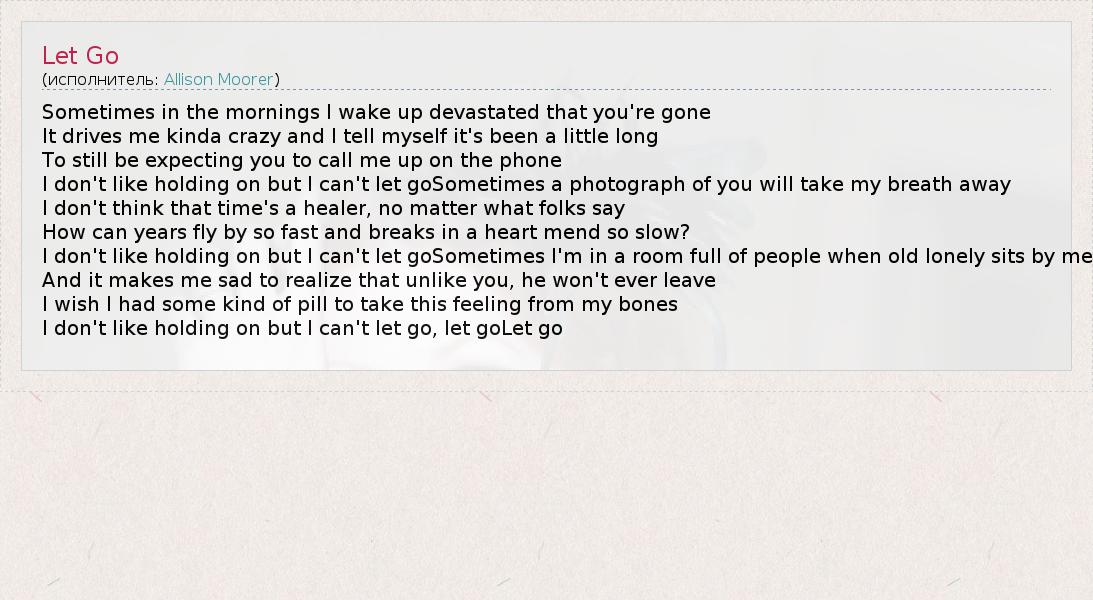 Sometimes in the mornings I wake up devastated that you're gone It drives me kinda crazy and I tell myself it's been a little long To still be expecting you to call me up on the phone I don't like holding on but I can't let goSometimes a photograph of you will take my breath away I don't think that time's a healer, no matter what folks say How can years fly by so fast and breaks in a heart mend so slow? I don't like holding on but I can't let goSometimes I'm in a room full of people when old lonely sits by me And it makes me sad to realize that unlike you, he won't ever leave I wish I had some kind of pill to take this feeling from my bones I don't like holding on but I can't let go, let goLet go