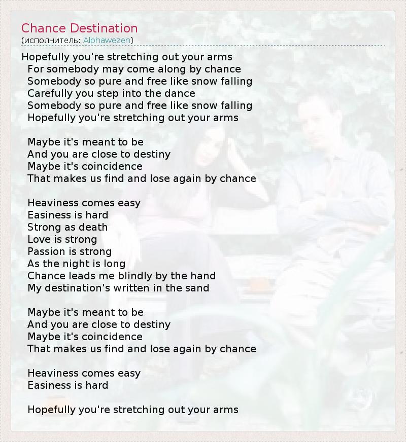 Hopefully you're stretching out your arms For somebody may come along by chance Somebody so pure and free like snow falling Carefully you step into the dance Somebody so pure and free like snow falling Hopefully you're stretching out your arms Maybe it's meant to be And you are close to destiny Maybe it's coincidence That makes us find and lose again by chance Heaviness comes easy Easiness is hard Strong as death Love is strong Passion is strong As the night is long Chance leads me blindly by the hand My destination's written in the sand Maybe it's meant to be And you are close to destiny Maybe it's coincidence That makes us find and lose again by chance Heaviness comes easy Easiness is hard Hopefully you're stretching out your arms
