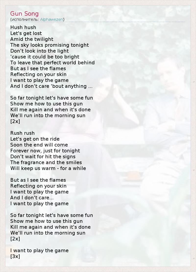 Тсс-тсс... Давай затеряемся В сумерках. Сегодня ночью небо выглядит многообещающим. Не смотри на свет, Он может быть слишком ярким, Чтобы этот безупречный мир остался позади. Но как только я вижу пламя, Отражающееся на твоей коже, Я хочу сыграть в игру, И мне уже ни до чего нет дела... А пока давай веселиться этой ночью. Покажи мне, как обращаться с этим пистолетом. Убей меня снова и после этого Мы направимся к утреннему солнцу. [2x] Беги-беги... Давай проедемся, Скоро придёт конец. Вот она вечность — этой ночью, Не нужно ждать знаков. Аромат и улыбки Будут согревать нас — недолго. Но как только я вижу пламя, Отражающееся на твоей коже, Я хочу сыграть в игру. И мне неважно... Я хочу сыграть в игру. А пока давай веселиться этой ночью. Покажи мне, как обращаться с этим пистолетом. Убей меня снова и после этого Мы направимся к утреннему солнцу. [2x] Я хочу сыграть в игру... [3x]