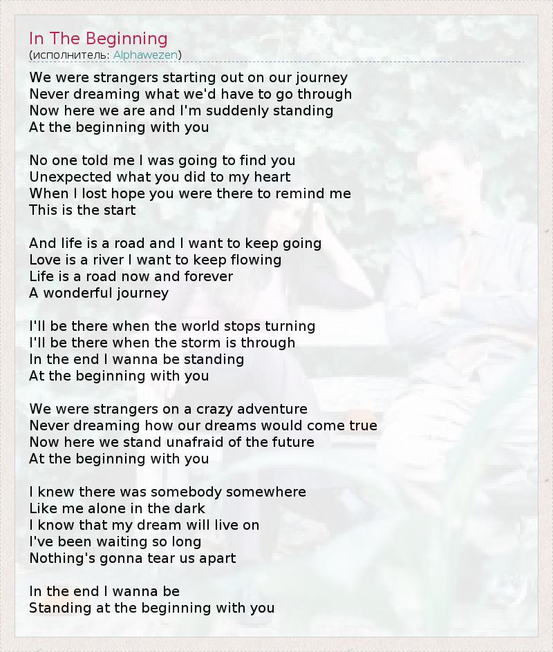 We were strangers starting out on our journey Never dreaming what we'd have to go through Now here we are and I'm suddenly standing At the beginning with you No one told me I was going to find you Unexpected what you did to my heart When I lost hope you were there to remind me This is the start And life is a road and I want to keep going Love is a river I want to keep flowing Life is a road now and forever A wonderful journey I'll be there when the world stops turning I'll be there when the storm is through In the end I wanna be standing At the beginning with you We were strangers on a crazy adventure Never dreaming how our dreams would come true Now here we stand unafraid of the future At the beginning with you I knew there was somebody somewhere Like me alone in the dark I know that my dream will live on I've been waiting so long Nothing's gonna tear us apart In the end I wanna be Standing at the beginning with you
