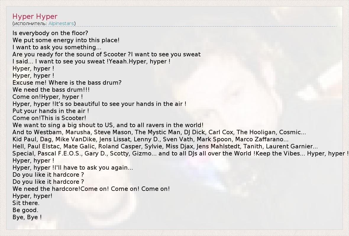 Is everybody on the floor? We put some energy into this place! I want to ask you something... Are you ready for the sound of Scooter ?I want to see you sweat I said... I want to see you sweat !Yeaah.Hyper, hyper ! Hyper, hyper ! Hyper, hyper ! Excuse me! Where is the bass drum? We need the bass drum!!! Come on!Hyper, hyper ! Hyper, hyper !It's so beautiful to see your hands in the air ! Put your hands in the air ! Come on!This is Scooter! We want to sing a big shout to US, and to all ravers in the world! And to Westbam, Marusha, Steve Mason, The Mystic Man, DJ Dick, Carl Cox, The Hooligan, Cosmic... Kid Paul, Dag, Mike VanDike, Jens Lissat, Lenny D., Sven Vath, Mark Spoon, Marco Zaffarano... Hell, Paul Elstac, Mate Galic, Roland Casper, Sylvie, Miss Djax, Jens Mahlstedt, Tanith, Laurent Garnier... Special, Pascal F.E.O.S., Gary D., Scotty, Gizmo... and to all DJs all over the World !Keep the Vibes... Hyper, hyper ! Hyper, hyper ! Hyper, hyper !I'll have to ask you again... Do you like it hardcore ? Do you like it hardcore ? We need the hardcore!Come on! Come on! Come on! Hyper, hyper! Sit there. Be good. Bye, Bye !