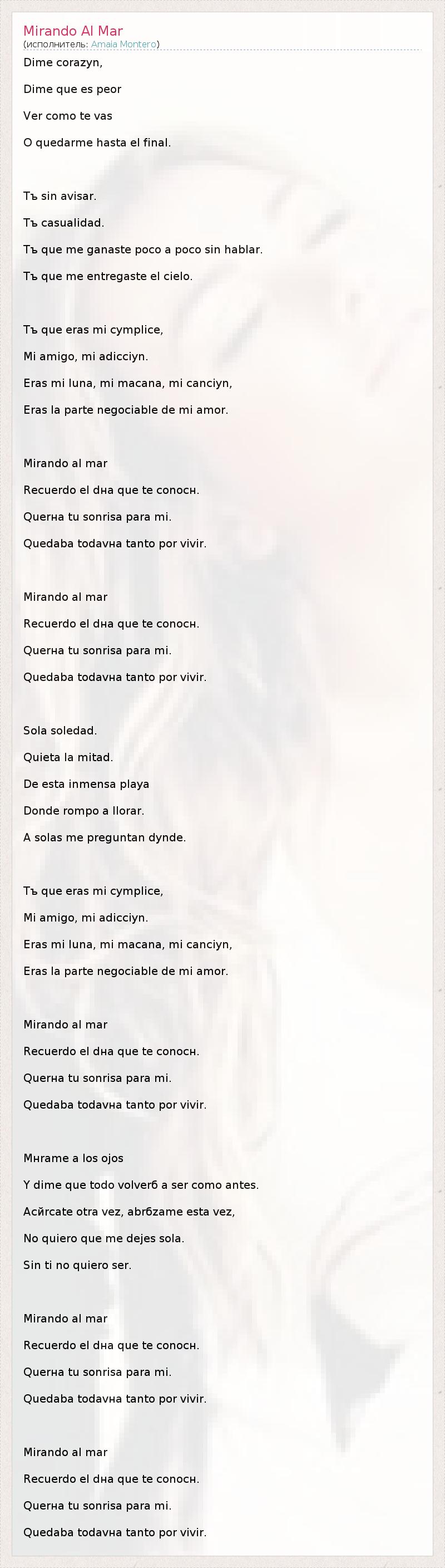Dime corazуn, Dime que es peor Ver como te vas O quedarme hasta el final. Tъ sin avisar. Tъ casualidad. Tъ que me ganaste poco a poco sin hablar. Tъ que me entregaste el cielo. Tъ que eras mi cуmplice, Mi amigo, mi adicciуn. Eras mi luna, mi maсana, mi canciуn, Eras la parte negociable de mi amor. Mirando al mar Recuerdo el dнa que te conocн. Querнa tu sonrisa para mi. Quedaba todavнa tanto por vivir. Mirando al mar Recuerdo el dнa que te conocн. Querнa tu sonrisa para mi. Quedaba todavнa tanto por vivir. Sola soledad. Quieta la mitad. De esta inmensa playa Donde rompo a llorar. A solas me preguntan dуnde. Tъ que eras mi cуmplice, Mi amigo, mi adicciуn. Eras mi luna, mi maсana, mi canciуn, Eras la parte negociable de mi amor. Mirando al mar Recuerdo el dнa que te conocн. Querнa tu sonrisa para mi. Quedaba todavнa tanto por vivir. Mнrame a los ojos Y dime que todo volverб a ser como antes. Acйrcate otra vez, abrбzame esta vez, No quiero que me dejes sola. Sin ti no quiero ser. Mirando al mar Recuerdo el dнa que te conocн. Querнa tu sonrisa para mi. Quedaba todavнa tanto por vivir. Mirando al mar Recuerdo el dнa que te conocн. Querнa tu sonrisa para mi. Quedaba todavнa tanto por vivir.