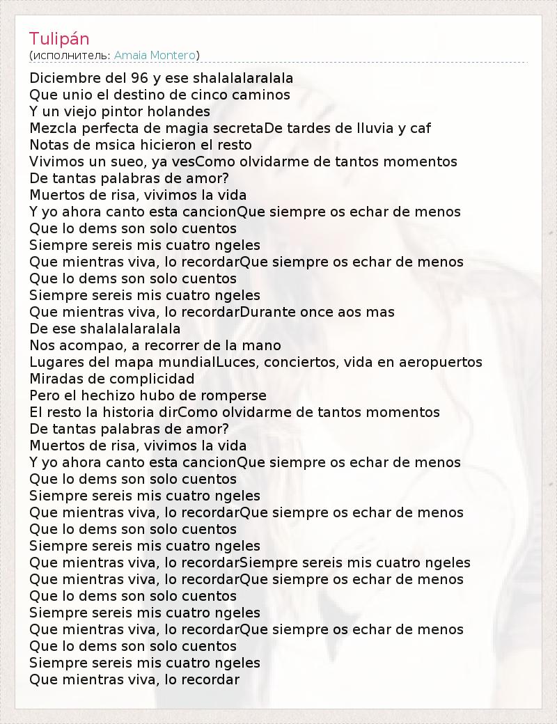 Diciembre del 96 y ese shalalalaralala Que unio el destino de cinco caminos Y un viejo pintor holandes Mezcla perfecta de magia secretaDe tardes de lluvia y caf Notas de msica hicieron el resto Vivimos un sueo, ya vesComo olvidarme de tantos momentos De tantas palabras de amor? Muertos de risa, vivimos la vida Y yo ahora canto esta cancionQue siempre os echar de menos Que lo dems son solo cuentos Siempre sereis mis cuatro ngeles Que mientras viva, lo recordarQue siempre os echar de menos Que lo dems son solo cuentos Siempre sereis mis cuatro ngeles Que mientras viva, lo recordarDurante once aos mas De ese shalalalaralala Nos acompao, a recorrer de la mano Lugares del mapa mundialLuces, conciertos, vida en aeropuertos Miradas de complicidad Pero el hechizo hubo de romperse El resto la historia dirComo olvidarme de tantos momentos De tantas palabras de amor? Muertos de risa, vivimos la vida Y yo ahora canto esta cancionQue siempre os echar de menos Que lo dems son solo cuentos Siempre sereis mis cuatro ngeles Que mientras viva, lo recordarQue siempre os echar de menos Que lo dems son solo cuentos Siempre sereis mis cuatro ngeles Que mientras viva, lo recordarSiempre sereis mis cuatro ngeles Que mientras viva, lo recordarQue siempre os echar de menos Que lo dems son solo cuentos Siempre sereis mis cuatro ngeles Que mientras viva, lo recordarQue siempre os echar de menos Que lo dems son solo cuentos Siempre sereis mis cuatro ngeles Que mientras viva, lo recordar