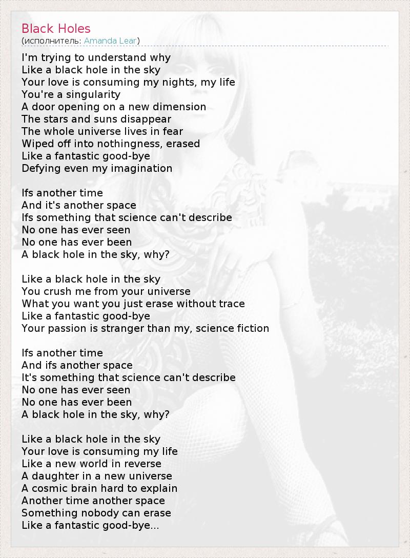 Я пытаюсь понять, почему Твоя любовь как черная дыра в небе Поглощает мои ночи, мою жизнь, Ты - центр черной дыры, Открытая дверь в новое измерение. Звезды и солнца исчезают, Вся Вселенная в страхе Исчезнуть в небытии, раствориться... Как фантастическое прощание, Игнорируешь даже мое воображение... Это другое время, Это другое пространство, Это то, что наука не в силах объяснить, Никто этого не видел, Никто там не был, Черная дыра в небе, почему? Как черная дыра в небесах Ты выбрасываешь меня из своей Вселенной, Чего ты хочешь, стереть меня без следа? Как фантастическое прощание, Твоя страсть ещё более странная, чем моя научная фантастика... Это другое время, Это другое пространство, Это то, что наука не в силах объяснить, Никто этого не видел, Никто там не был, Черная дыра в небе, почему? Как черная дыра в небесах Твоя любовь поглощает мою жизнь, Это перевернутый новый мир, Дочь в новой вселенной. Космический разум трудно объяснить, Другое время, другое пространство, Кое-что никто не сможет стереть... Как фантастическое прощание...