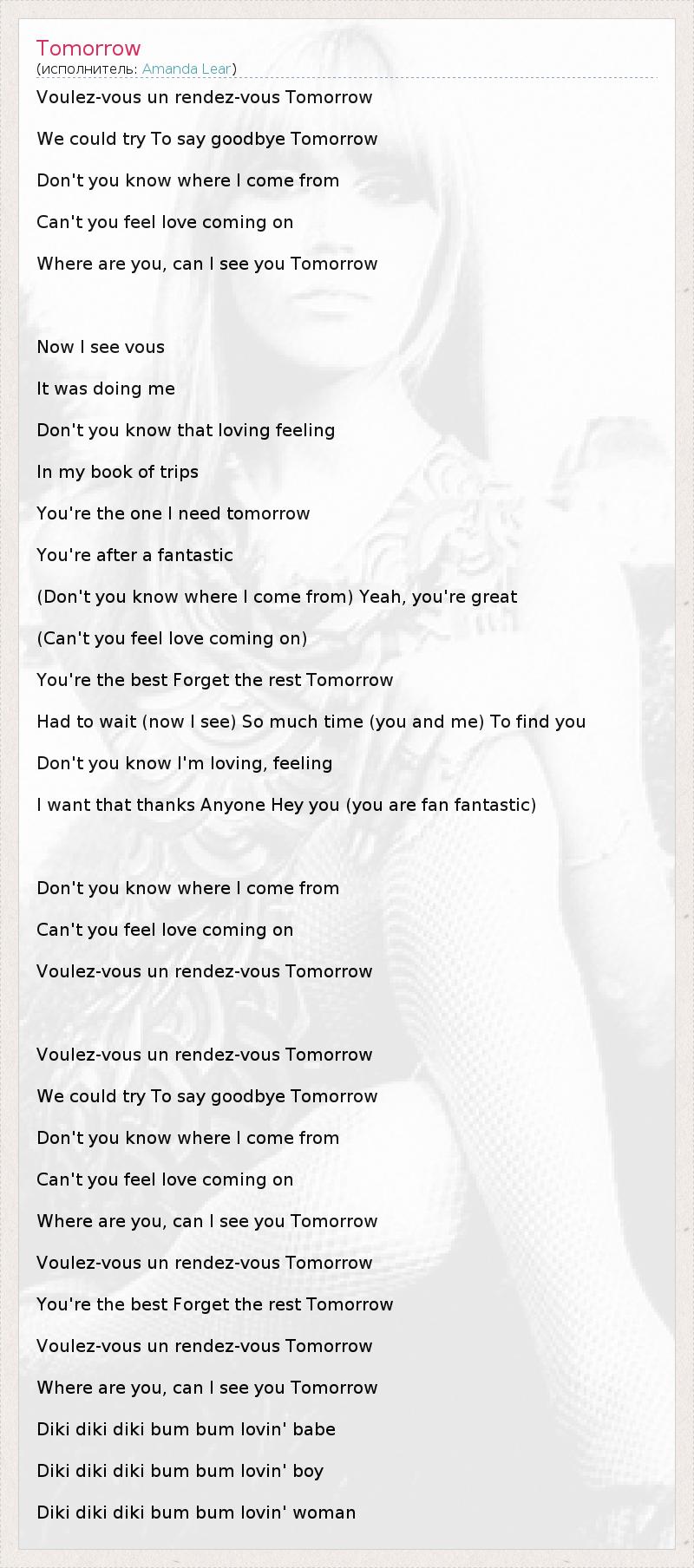 Voulez-vous un rendez-vous Tomorrow We could try To say goodbye Tomorrow Don't you know where I come from Can't you feel love coming on Where are you, can I see you Tomorrow Now I see vous It was doing me Don't you know that loving feeling In my book of trips You're the one I need tomorrow You're after a fantastic (Don't you know where I come from) Yeah, you're great (Can't you feel love coming on) You're the best Forget the rest Tomorrow Had to wait (now I see) So much time (you and me) To find you Don't you know I'm loving, feeling I want that thanks Anyone Hey you (you are fan fantastic) Don't you know where I come from Can't you feel love coming on Voulez-vous un rendez-vous Tomorrow Voulez-vous un rendez-vous Tomorrow We could try To say goodbye Tomorrow Don't you know where I come from Can't you feel love coming on Where are you, can I see you Tomorrow Voulez-vous un rendez-vous Tomorrow You're the best Forget the rest Tomorrow Voulez-vous un rendez-vous Tomorrow Where are you, can I see you Tomorrow Diki diki diki bum bum lovin' babe Diki diki diki bum bum lovin' boy Diki diki diki bum bum lovin' woman