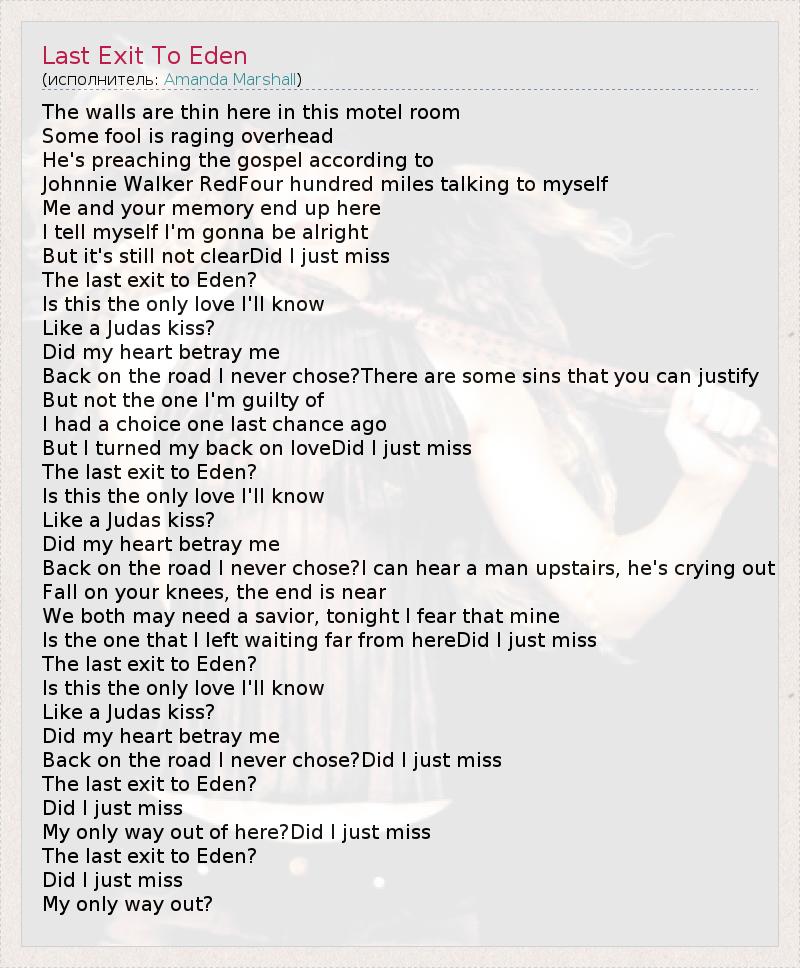 The walls are thin here in this motel room Some fool is raging overhead He's preaching the gospel according to Johnnie Walker RedFour hundred miles talking to myself Me and your memory end up here I tell myself I'm gonna be alright But it's still not clearDid I just miss The last exit to Eden? Is this the only love I'll know Like a Judas kiss? Did my heart betray me Back on the road I never chose?There are some sins that you can justify But not the one I'm guilty of I had a choice one last chance ago But I turned my back on loveDid I just miss The last exit to Eden? Is this the only love I'll know Like a Judas kiss? Did my heart betray me Back on the road I never chose?I can hear a man upstairs, he's crying out Fall on your knees, the end is near We both may need a savior, tonight I fear that mine Is the one that I left waiting far from hereDid I just miss The last exit to Eden? Is this the only love I'll know Like a Judas kiss? Did my heart betray me Back on the road I never chose?Did I just miss The last exit to Eden? Did I just miss My only way out of here?Did I just miss The last exit to Eden? Did I just miss My only way out?