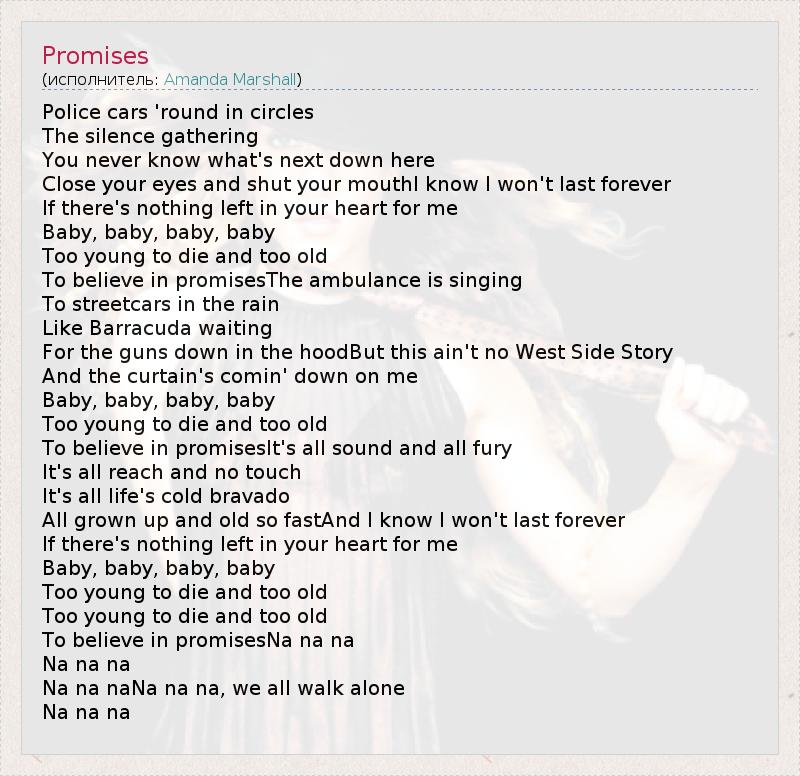 Police cars 'round in circles The silence gathering You never know what's next down here Close your eyes and shut your mouthI know I won't last forever If there's nothing left in your heart for me Baby, baby, baby, baby Too young to die and too old To believe in promisesThe ambulance is singing To streetcars in the rain Like Barracuda waiting For the guns down in the hoodBut this ain't no West Side Story And the curtain's comin' down on me Baby, baby, baby, baby Too young to die and too old To believe in promisesIt's all sound and all fury It's all reach and no touch It's all life's cold bravado All grown up and old so fastAnd I know I won't last forever If there's nothing left in your heart for me Baby, baby, baby, baby Too young to die and too old Too young to die and too old To believe in promisesNa na na Na na na Na na naNa na na, we all walk alone Na na na
