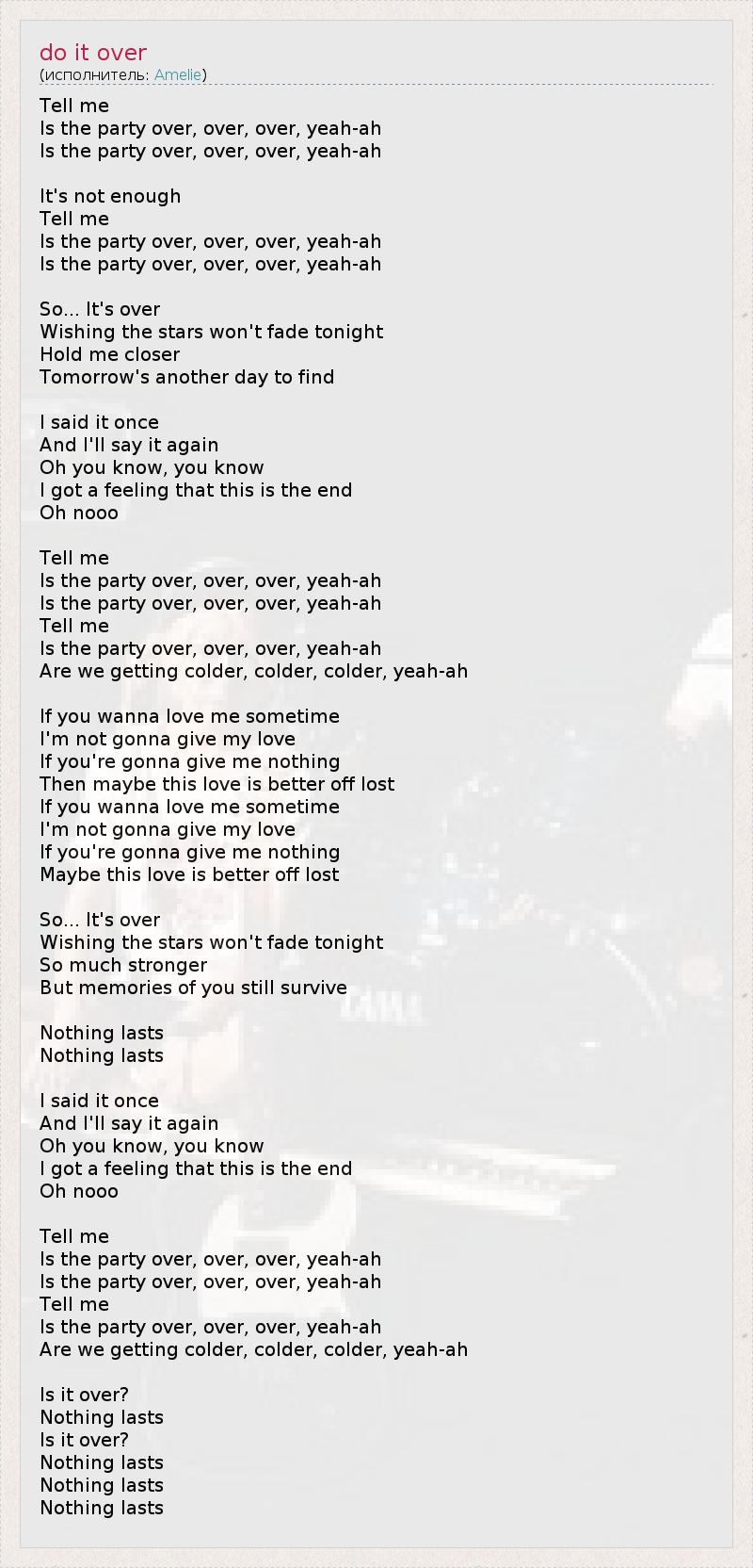 Tell me Is the party over, over, over, yeah-ah Is the party over, over, over, yeah-ah It's not enough Tell me Is the party over, over, over, yeah-ah Is the party over, over, over, yeah-ah So... It's over Wishing the stars won't fade tonight Hold me closer Tomorrow's another day to find I said it once And I'll say it again Oh you know, you know I got a feeling that this is the end Oh nooo Tell me Is the party over, over, over, yeah-ah Is the party over, over, over, yeah-ah Tell me Is the party over, over, over, yeah-ah Are we getting colder, colder, colder, yeah-ah If you wanna love me sometime I'm not gonna give my love If you're gonna give me nothing Then maybe this love is better off lost If you wanna love me sometime I'm not gonna give my love If you're gonna give me nothing Maybe this love is better off lost So... It's over Wishing the stars won't fade tonight So much stronger But memories of you still survive Nothing lasts Nothing lasts I said it once And I'll say it again Oh you know, you know I got a feeling that this is the end Oh nooo Tell me Is the party over, over, over, yeah-ah Is the party over, over, over, yeah-ah Tell me Is the party over, over, over, yeah-ah Are we getting colder, colder, colder, yeah-ah Is it over? Nothing lasts Is it over? Nothing lasts Nothing lasts Nothing lasts