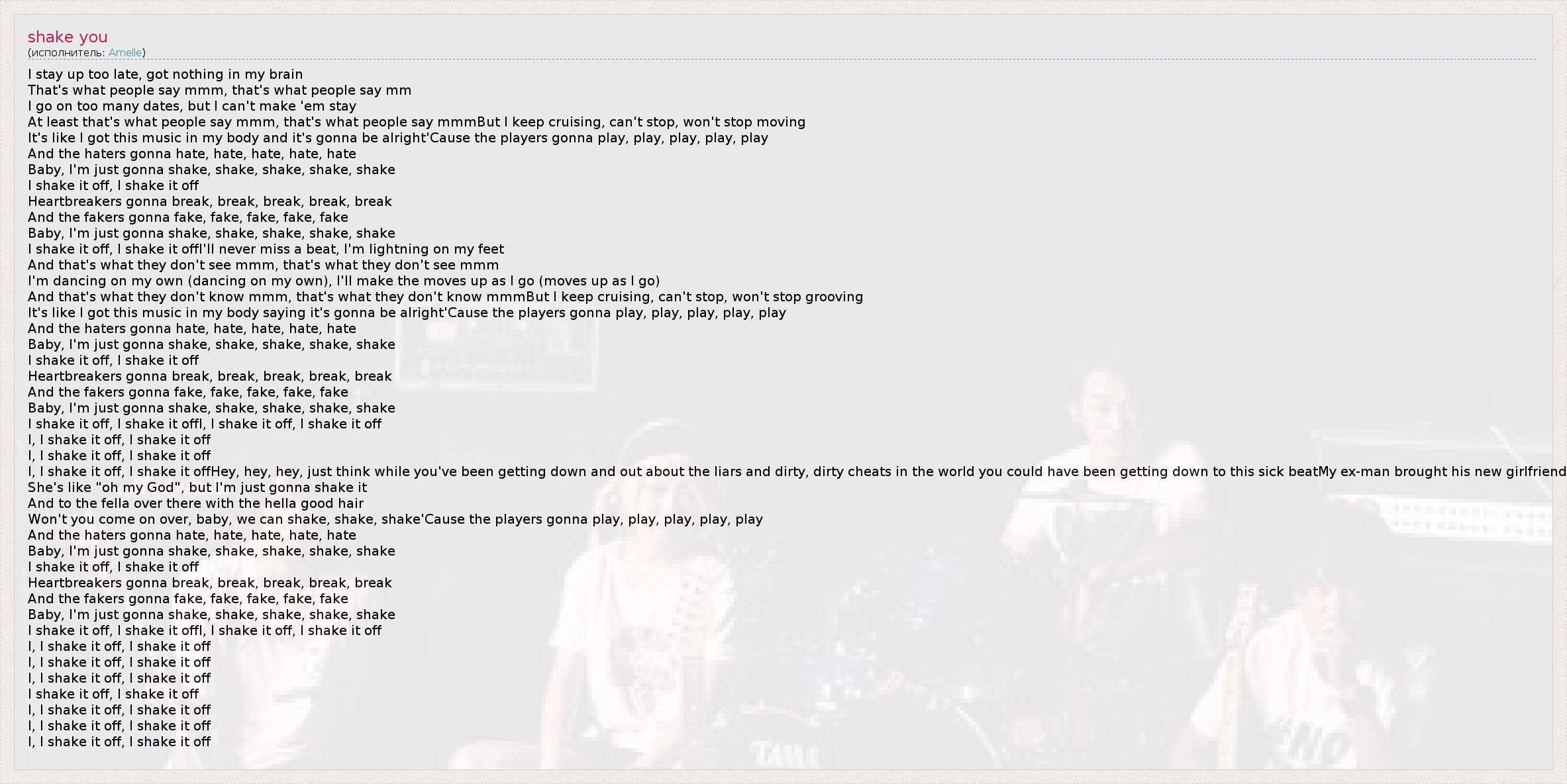 I stay up too late, got nothing in my brain That's what people say mmm, that's what people say mm I go on too many dates, but I can't make 'em stay At least that's what people say mmm, that's what people say mmmBut I keep cruising, can't stop, won't stop moving It's like I got this music in my body and it's gonna be alright'Cause the players gonna play, play, play, play, play And the haters gonna hate, hate, hate, hate, hate Baby, I'm just gonna shake, shake, shake, shake, shake I shake it off, I shake it off Heartbreakers gonna break, break, break, break, break And the fakers gonna fake, fake, fake, fake, fake Baby, I'm just gonna shake, shake, shake, shake, shake I shake it off, I shake it offI'll never miss a beat, I'm lightning on my feet And that's what they don't see mmm, that's what they don't see mmm I'm dancing on my own (dancing on my own), I'll make the moves up as I go (moves up as I go) And that's what they don't know mmm, that's what they don't know mmmBut I keep cruising, can't stop, won't stop grooving It's like I got this music in my body saying it's gonna be alright'Cause the players gonna play, play, play, play, play And the haters gonna hate, hate, hate, hate, hate Baby, I'm just gonna shake, shake, shake, shake, shake I shake it off, I shake it off Heartbreakers gonna break, break, break, break, break And the fakers gonna fake, fake, fake, fake, fake Baby, I'm just gonna shake, shake, shake, shake, shake I shake it off, I shake it offI, I shake it off, I shake it off I, I shake it off, I shake it off I, I shake it off, I shake it off I, I shake it off, I shake it offHey, hey, hey, just think while you've been getting down and out about the liars and dirty, dirty cheats in the world you could have been getting down to this sick beatMy ex-man brought his new girlfriend She's like "oh my God", but I'm just gonna shake it And to the fella over there with the hella good hair Won't you come on over, baby, we can shake, shake, shake'Cause the players gonna play, play, play, play, play And the haters gonna hate, hate, hate, hate, hate Baby, I'm just gonna shake, shake, shake, shake, shake I shake it off, I shake it off Heartbreakers gonna break, break, break, break, break And the fakers gonna fake, fake, fake, fake, fake Baby, I'm just gonna shake, shake, shake, shake, shake I shake it off, I shake it offI, I shake it off, I shake it off I, I shake it off, I shake it off I, I shake it off, I shake it off I, I shake it off, I shake it off I shake it off, I shake it off I, I shake it off, I shake it off I, I shake it off, I shake it off I, I shake it off, I shake it off
