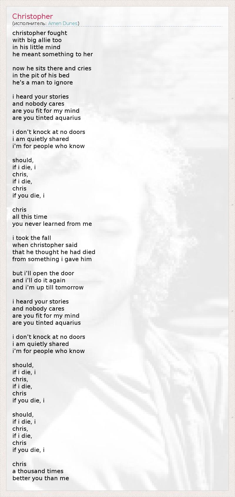 christopher fought with big allie too in his little mind he meant something to her now he sits there and cries in the pit of his bed he's a man to ignore i heard your stories and nobody cares are you fit for my mind are you tinted aquarius i don't knock at no doors i am quietly shared i'm for people who know should, if i die, i chris, if i die, chris if you die, i chris all this time you never learned from me i took the fall when christopher said that he thought he had died from something i gave him but i'll open the door and i'll do it again and i'm up till tomorrow i heard your stories and nobody cares are you fit for my mind are you tinted aquarius i don't knock at no doors i am quietly shared i'm for people who know should, if i die, i chris, if i die, chris if you die, i should, if i die, i chris, if i die, chris if you die, i chris a thousand times better you than me