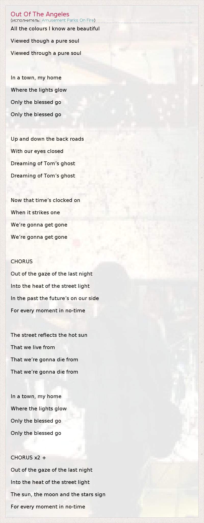 All the colours I know are beautiful Viewed though a pure soul Viewed through a pure soul In a town, my home Where the lights glow Only the blessed go Only the blessed go Up and down the back roads With our eyes closed Dreaming of Tom’s ghost Dreaming of Tom’s ghost Now that time’s clocked on When it strikes one We’re gonna get gone We’re gonna get gone CHORUS Out of the gaze of the last night Into the heat of the street light In the past the future’s on our side For every moment in no-time The street reflects the hot sun That we live from That we’re gonna die from That we’re gonna die from In a town, my home Where the lights glow Only the blessed go Only the blessed go CHORUS x2 + Out of the gaze of the last night Into the heat of the street light The sun, the moon and the stars sign For every moment in no-time