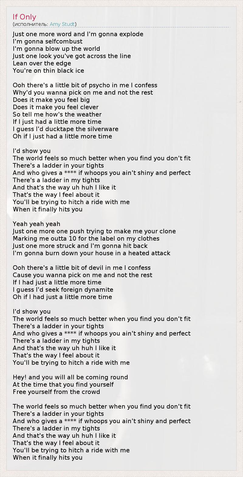 Just one more word and I'm gonna explode I'm gonna selfcombust I'm gonna blow up the world Just one look you've got across the line Lean over the edge You're on thin black ice Ooh there's a little bit of psycho in me I confess Why'd you wanna pick on me and not the rest Does it make you feel big Does it make you feel clever So tell me how's the weather If I just had a little more time I guess I'd ducktape the silverware Oh if I just had a little more time I'd show you The world feels so much better when you find you don't fit There's a ladder in your tights And who gives a **** if whoops you ain't shiny and perfect There's a ladder in my tights And that's the way uh huh I like it That's the way I feel about it You'll be trying to hitch a ride with me When it finally hits you Yeah yeah yeah Just one more one push trying to make me your clone Marking me outta 10 for the label on my clothes Just one more struck and I'm gonna hit back I'm gonna burn down your house in a heated attack Ooh there's a little bit of devil in me I confess Cause you wanna pick on me and not the rest If I had just a little more time I guess I'd seek foreign dynamite Oh if I had just a little more time I'd show you The world feels so much better when you find you don't fit There's a ladder in your tights And who gives a **** if whoops you ain't shiny and perfect There's a ladder in my tights And that's the way uh huh I like it That's the way I feel about it You'll be trying to hitch a ride with me Hey! and you will all be coming round At the time that you find yourself Free yourself from the crowd The world feels so much better when you find you don't fit There's a ladder in your tights And who gives a **** if whoops you ain't shiny and perfect There's a ladder in my tights And that's the way uh huh I like it That's the way I feel about it You'll be trying to hitch a ride with me When it finally hits you