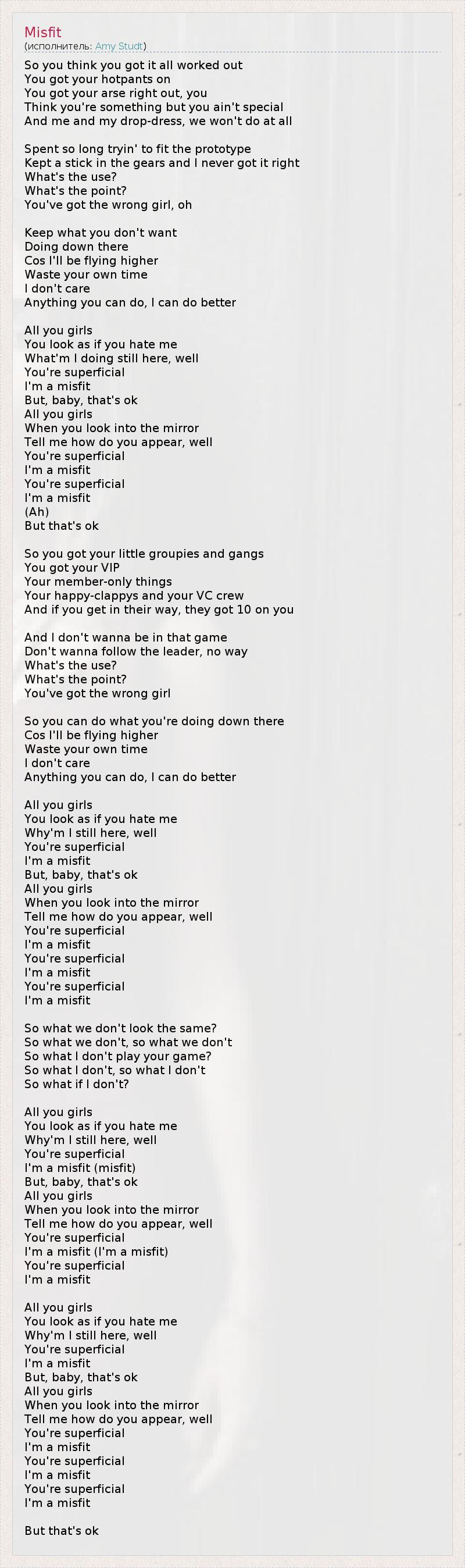 So you think you got it all worked out You got your hotpants on You got your arse right out, you Think you're something but you ain't special And me and my drop-dress, we won't do at all Spent so long tryin' to fit the prototype Kept a stick in the gears and I never got it right What's the use? What's the point? You've got the wrong girl, oh Keep what you don't want Doing down there Cos I'll be flying higher Waste your own time I don't care Anything you can do, I can do better All you girls You look as if you hate me What'm I doing still here, well You're superficial I'm a misfit But, baby, that's ok All you girls When you look into the mirror Tell me how do you appear, well You're superficial I'm a misfit You're superficial I'm a misfit (Ah) But that's ok So you got your little groupies and gangs You got your VIP Your member-only things Your happy-clappys and your VC crew And if you get in their way, they got 10 on you And I don't wanna be in that game Don't wanna follow the leader, no way What's the use? What's the point? You've got the wrong girl So you can do what you're doing down there Cos I'll be flying higher Waste your own time I don't care Anything you can do, I can do better All you girls You look as if you hate me Why'm I still here, well You're superficial I'm a misfit But, baby, that's ok All you girls When you look into the mirror Tell me how do you appear, well You're superficial I'm a misfit You're superficial I'm a misfit You're superficial I'm a misfit So what we don't look the same? So what we don't, so what we don't So what I don't play your game? So what I don't, so what I don't So what if I don't? All you girls You look as if you hate me Why'm I still here, well You're superficial I'm a misfit (misfit) But, baby, that's ok All you girls When you look into the mirror Tell me how do you appear, well You're superficial I'm a misfit (I'm a misfit) You're superficial I'm a misfit All you girls You look as if you hate me Why'm I still here, well You're superficial I'm a misfit But, baby, that's ok All you girls When you look into the mirror Tell me how do you appear, well You're superficial I'm a misfit You're superficial I'm a misfit You're superficial I'm a misfit But that's ok
