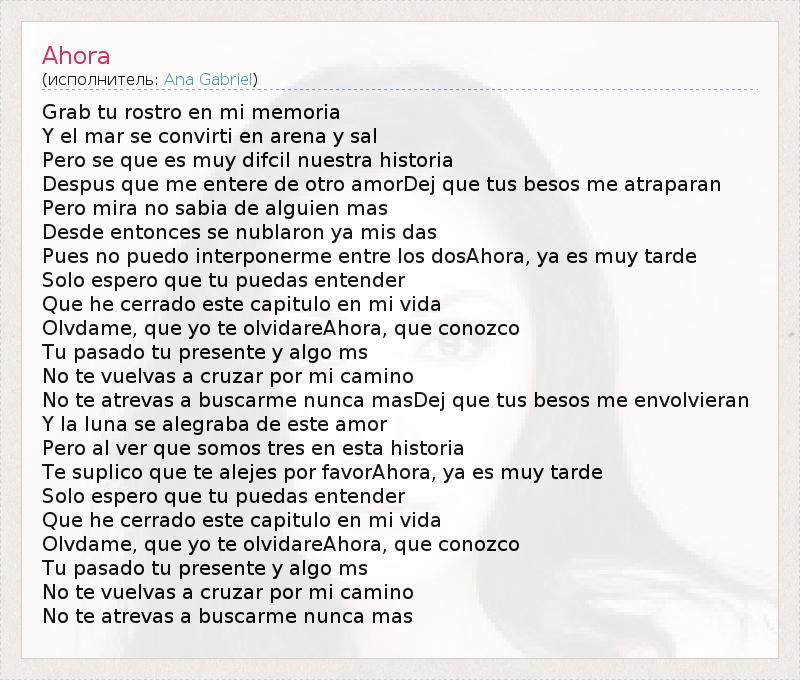 Grab tu rostro en mi memoria Y el mar se convirti en arena y sal Pero se que es muy difcil nuestra historia Despus que me entere de otro amorDej que tus besos me atraparan Pero mira no sabia de alguien mas Desde entonces se nublaron ya mis das Pues no puedo interponerme entre los dosAhora, ya es muy tarde Solo espero que tu puedas entender Que he cerrado este capitulo en mi vida Olvdame, que yo te olvidareAhora, que conozco Tu pasado tu presente y algo ms No te vuelvas a cruzar por mi camino No te atrevas a buscarme nunca masDej que tus besos me envolvieran Y la luna se alegraba de este amor Pero al ver que somos tres en esta historia Te suplico que te alejes por favorAhora, ya es muy tarde Solo espero que tu puedas entender Que he cerrado este capitulo en mi vida Olvdame, que yo te olvidareAhora, que conozco Tu pasado tu presente y algo ms No te vuelvas a cruzar por mi camino No te atrevas a buscarme nunca mas