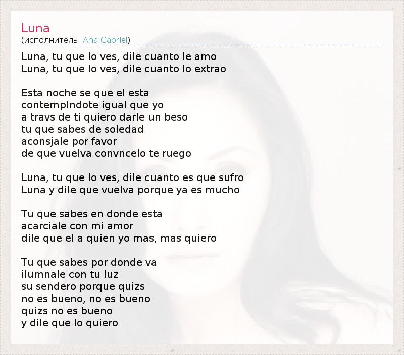 Luna, tu que lo ves, dile cuanto le amo Luna, tu que lo ves, dile cuanto lo extrao Esta noche se que el esta contemplndote igual que yo a travs de ti quiero darle un beso tu que sabes de soledad aconsjale por favor de que vuelva convncelo te ruego Luna, tu que lo ves, dile cuanto es que sufro Luna y dile que vuelva porque ya es mucho Tu que sabes en donde esta acarciale con mi amor dile que el a quien yo mas, mas quiero Tu que sabes por donde va ilumnale con tu luz su sendero porque quizs no es bueno, no es bueno quizs no es bueno y dile que lo quiero
