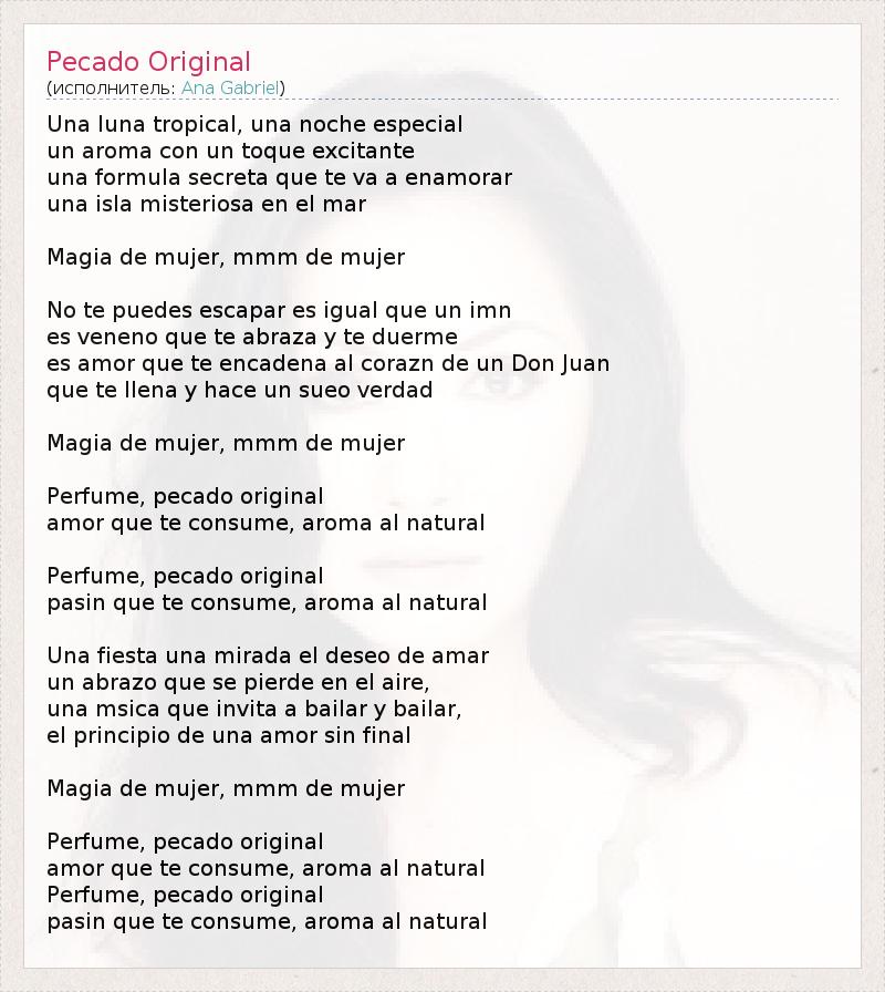 Una luna tropical, una noche especial un aroma con un toque excitante una formula secreta que te va a enamorar una isla misteriosa en el mar Magia de mujer, mmm de mujer No te puedes escapar es igual que un imn es veneno que te abraza y te duerme es amor que te encadena al corazn de un Don Juan que te llena y hace un sueo verdad Magia de mujer, mmm de mujer Perfume, pecado original amor que te consume, aroma al natural Perfume, pecado original pasin que te consume, aroma al natural Una fiesta una mirada el deseo de amar un abrazo que se pierde en el aire, una msica que invita a bailar y bailar, el principio de una amor sin final Magia de mujer, mmm de mujer Perfume, pecado original amor que te consume, aroma al natural Perfume, pecado original pasin que te consume, aroma al natural