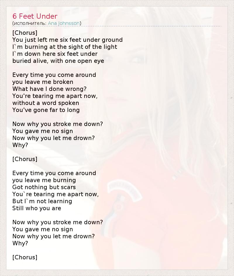 [Chorus] You just left me six feet under ground I`m burning at the sight of the light I`m down here six feet under buried alive, with one open eye Every time you come around you leave me broken What have I done wrong? You're tearing me apart now, without a word spoken You've gone far to long Now why you stroke me down? You gave me no sign Now why you let me drown? Why? [Chorus] Every time you come around you leave me burning Got nothing but scars You`re tearing me apart now, But I`m not learning Still who you are Now why you stroke me down? You gave me no sign Now why you let me drown? Why? [Chorus]