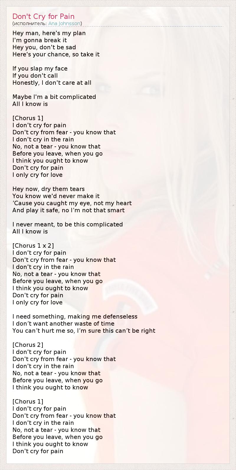 Эй, парень, вот мой план Я собираюсь покончить с этим Эй, ты, не грусти Вот твой шанс, так используй его Если ты ударяешь меня по лицу Если ты не звонишь Честно, мне как то плевать Возможно, я немного сложна Это всё, что я знаю [Припев 1] Я не плачу от боли Не плачу от страха - ты знаешь это Я не плачу в дождь Нет, я не реву - ты знаешь это Прежде, чем ты оставишь меня Я думаю, что ты должен знать Я не плачу от боли Я просто плачу от любви Эй, теперь, высуши их слезы Ты знаешь, что мы бы никогда не сделали это Ведь ты поймал мой взгляд, а не моё сердце И не рискуй, нет, я не такая умная Я никогда не хотела, чтобы всё усложнилось Это всё, что я знаю [Припев 1 x 2] Я не плачу от боли Не плачу от страха - ты знаешь это Я не плачу в дождь Нет, я не реву - ты знаешь это Прежде, чем ты оставишь меня Я думаю, что ты должен знать Я не плачу от боли Я просто плачу от любви Мне нужно что-то, что сделает меня беззащитной Я не хочу впустую тратить временя Ты не можешь причинить мне боль, я уверена, что это не может быть правильным [Припев 2] Я не плачу от боли Не плачу от страха - ты знаешь это Я не плачу в дождь Нет, я не реву - ты знаешь это Прежде, чем ты оставишь меня Я думаю, что ты должен знать [Пойте хором 1] Я не плачу от боли Не плачу от страха - ты знаешь это Я не плачу в дождь Нет, я не реву - ты знаешь это Прежде, чем ты оставишь меня Я думаю, что ты должен знать Я не плачу от боли