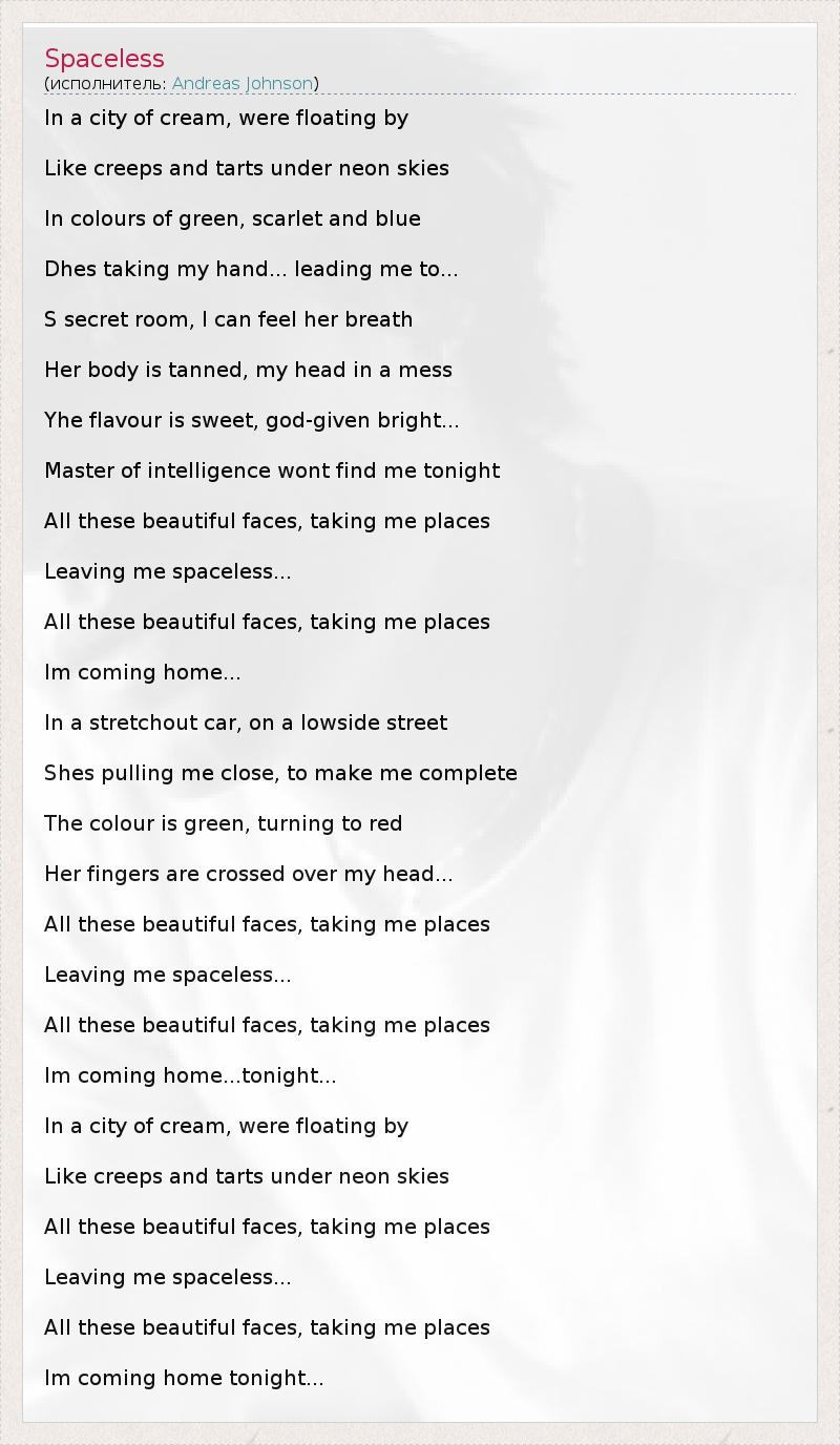 In a city of cream, were floating by Like creeps and tarts under neon skies In colours of green, scarlet and blue Dhes taking my hand... leading me to... S secret room, I can feel her breath Her body is tanned, my head in a mess Yhe flavour is sweet, god-given bright... Master of intelligence wont find me tonight All these beautiful faces, taking me places Leaving me spaceless... All these beautiful faces, taking me places Im coming home... In a stretchout car, on a lowside street Shes pulling me close, to make me complete The colour is green, turning to red Her fingers are crossed over my head... All these beautiful faces, taking me places Leaving me spaceless... All these beautiful faces, taking me places Im coming home...tonight... In a city of cream, were floating by Like creeps and tarts under neon skies All these beautiful faces, taking me places Leaving me spaceless... All these beautiful faces, taking me places Im coming home tonight...