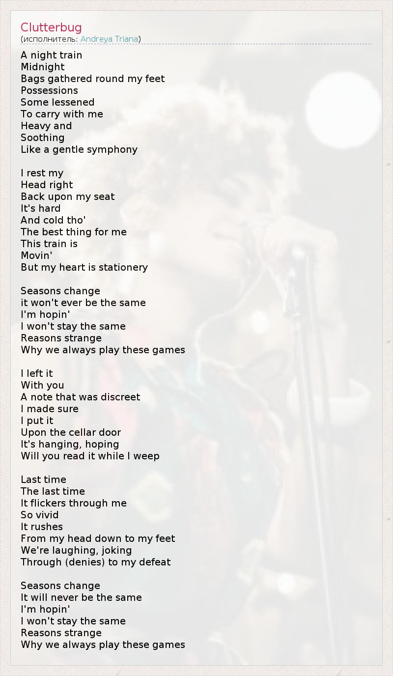A night train Midnight Bags gathered round my feet Possessions Some lessened To carry with me Heavy and Soothing Like a gentle symphony I rest my Head right Back upon my seat It's hard And cold tho' The best thing for me This train is Movin' But my heart is stationery Seasons change it won't ever be the same I'm hopin' I won't stay the same Reasons strange Why we always play these games I left it With you A note that was discreet I made sure I put it Upon the cellar door It's hanging, hoping Will you read it while I weep Last time The last time It flickers through me So vivid It rushes From my head down to my feet We're laughing, joking Through (denies) to my defeat Seasons change It will never be the same I'm hopin' I won't stay the same Reasons strange Why we always play these games