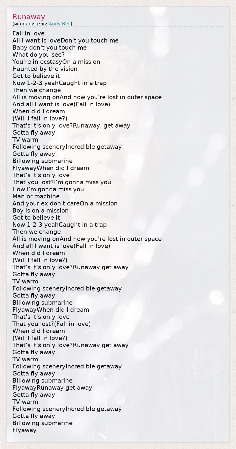 Fall in love All I want is loveDon't you touch me Baby don't you touch me What do you see? You're in ecstasyOn a mission Haunted by the vision Got to believe it Now 1-2-3 yeahCaught in a trap Then we change All is moving onAnd now you're lost in outer space And all I want is love(Fall in love) When did I dream (Will I fall in love?) That's it's only love?Runaway, get away Gotta fly away TV warm Following sceneryIncredible getaway Gotta fly away Billowing submarine FlyawayWhen did I dream That's it's only love That you lost?I'm gonna miss you How I'm gonna miss you Man or machine And your ex don't careOn a mission Boy is on a mission Got to believe it Now 1-2-3 yeahCaught in a trap Then we change All is moving onAnd now you're lost in outer space And all I want is love(Fall in love) When did I dream (Will I fall in love?) That's it's only love?Runaway get away Gotta fly away TV warm Following sceneryIncredible getaway Gotta fly away Billowing submarine FlyawayWhen did I dream That's it's only love That you lost?(Fall in love) When did I dream (Will I fall in love?) That's it's only love?Runaway get away Gotta fly away TV warm Following sceneryIncredible getaway Gotta fly away Billowing submarine FlyawayRunaway get away Gotta fly away TV warm Following sceneryIncredible getaway Gotta fly away Billowing submarine Flyaway