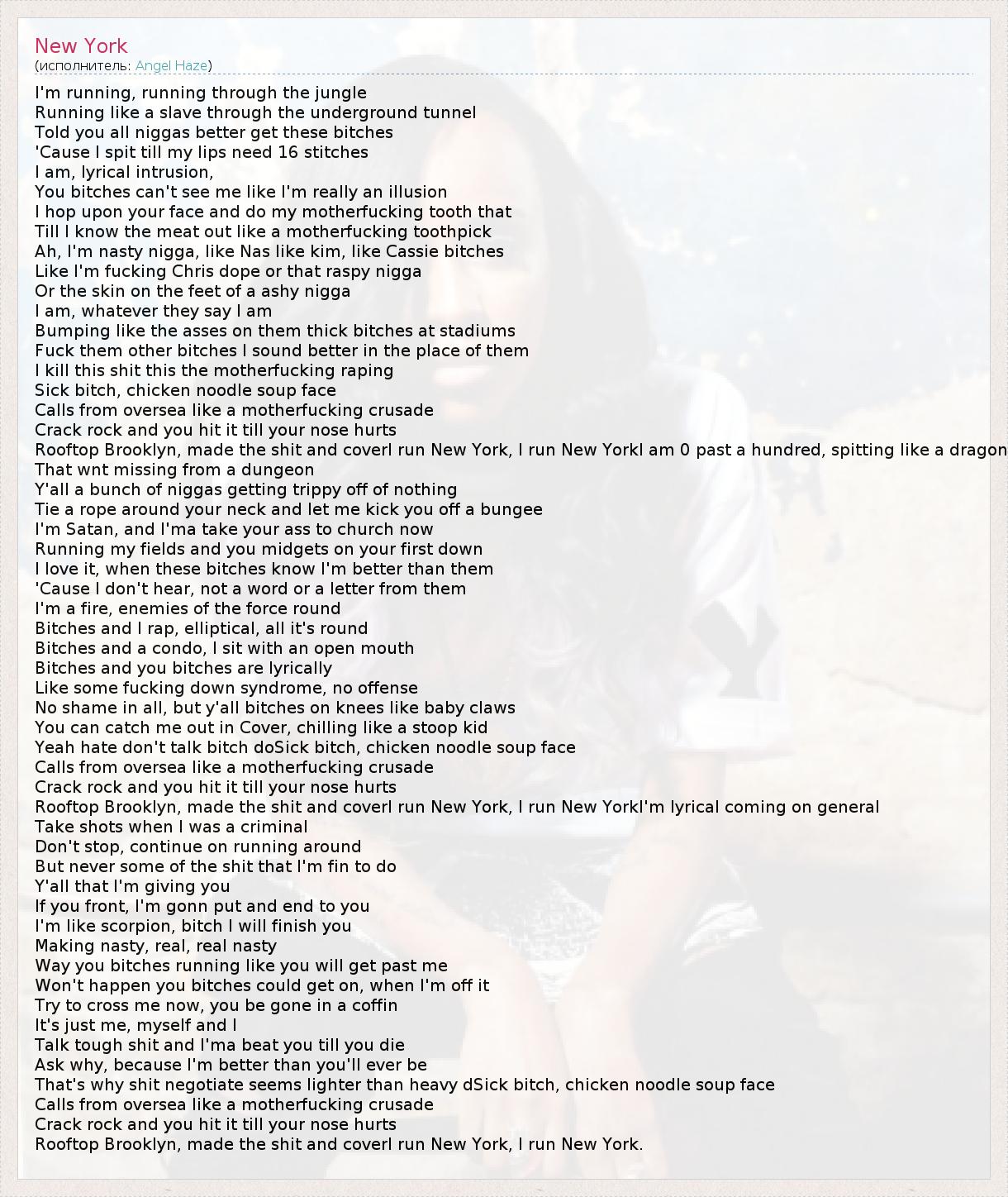 I'm running, running through the jungle Running like a slave through the underground tunnel Told you all niggas better get these bitches 'Cause I spit till my lips need 16 stitches I am, lyrical intrusion, You bitches can't see me like I'm really an illusion I hop upon your face and do my motherfucking tooth that Till I know the meat out like a motherfucking toothpick Ah, I'm nasty nigga, like Nas like kim, like Cassie bitches Like I'm fucking Chris dope or that raspy nigga Or the skin on the feet of a ashy nigga I am, whatever they say I am Bumping like the asses on them thick bitches at stadiums Fuck them other bitches I sound better in the place of them I kill this shit this the motherfucking raping Sick bitch, chicken noodle soup face Calls from oversea like a motherfucking crusade Crack rock and you hit it till your nose hurts Rooftop Brooklyn, made the shit and coverI run New York, I run New YorkI am 0 past a hundred, spitting like a dragon That wnt missing from a dungeon Y'all a bunch of niggas getting trippy off of nothing Tie a rope around your neck and let me kick you off a bungee I'm Satan, and I'ma take your ass to church now Running my fields and you midgets on your first down I love it, when these bitches know I'm better than them 'Cause I don't hear, not a word or a letter from them I'm a fire, enemies of the force round Bitches and I rap, elliptical, all it's round Bitches and a condo, I sit with an open mouth Bitches and you bitches are lyrically Like some fucking down syndrome, no offense No shame in all, but y'all bitches on knees like baby claws You can catch me out in Cover, chilling like a stoop kid Yeah hate don't talk bitch doSick bitch, chicken noodle soup face Calls from oversea like a motherfucking crusade Crack rock and you hit it till your nose hurts Rooftop Brooklyn, made the shit and coverI run New York, I run New YorkI'm lyrical coming on general Take shots when I was a criminal Don't stop, continue on running around But never some of the shit that I'm fin to do Y'all that I'm giving you If you front, I'm gonn put and end to you I'm like scorpion, bitch I will finish you Making nasty, real, real nasty Way you bitches running like you will get past me Won't happen you bitches could get on, when I'm off it Try to cross me now, you be gone in a coffin It's just me, myself and I Talk tough shit and I'ma beat you till you die Ask why, because I'm better than you'll ever be That's why shit negotiate seems lighter than heavy dSick bitch, chicken noodle soup face Calls from oversea like a motherfucking crusade Crack rock and you hit it till your nose hurts Rooftop Brooklyn, made the shit and coverI run New York, I run New York.