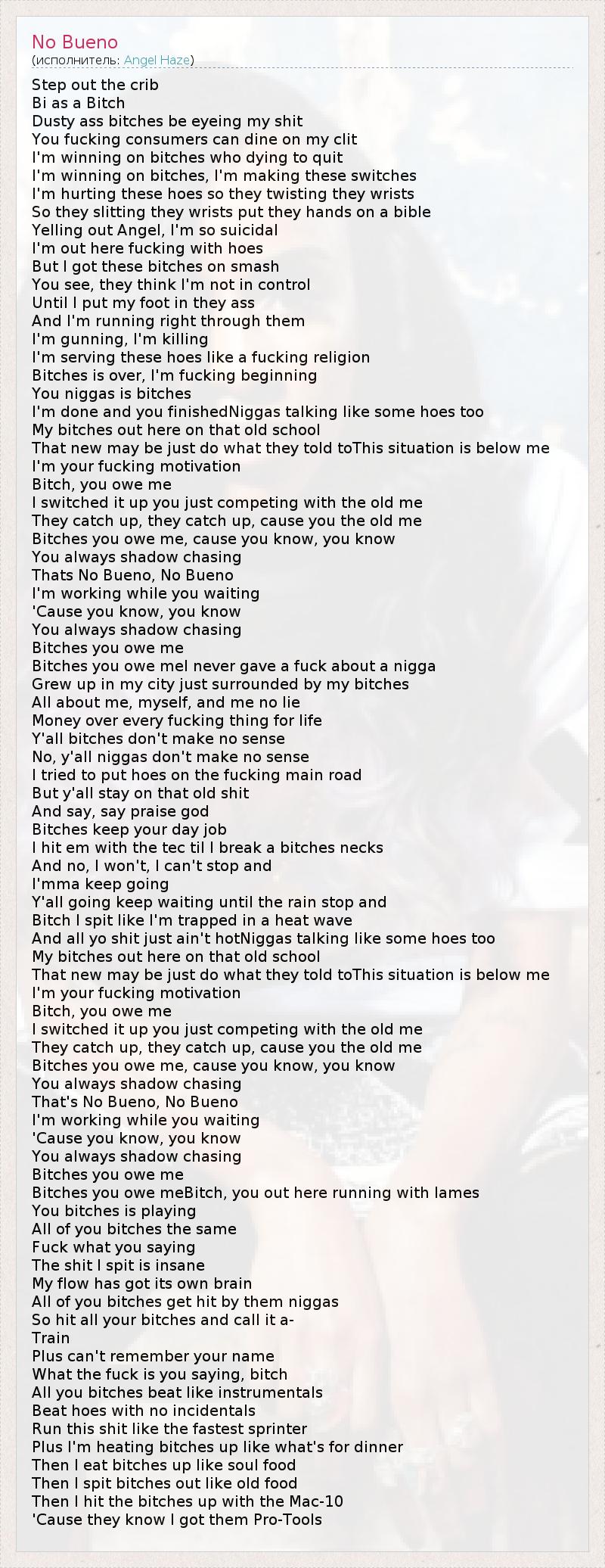 Step out the crib Bi as a Bitch Dusty ass bitches be eyeing my shit You fucking consumers can dine on my clit I'm winning on bitches who dying to quit I'm winning on bitches, I'm making these switches I'm hurting these hoes so they twisting they wrists So they slitting they wrists put they hands on a bible Yelling out Angel, I'm so suicidal I'm out here fucking with hoes But I got these bitches on smash You see, they think I'm not in control Until I put my foot in they ass And I'm running right through them I'm gunning, I'm killing I'm serving these hoes like a fucking religion Bitches is over, I'm fucking beginning You niggas is bitches I'm done and you finishedNiggas talking like some hoes too My bitches out here on that old school That new may be just do what they told toThis situation is below me I'm your fucking motivation Bitch, you owe me I switched it up you just competing with the old me They catch up, they catch up, cause you the old me Bitches you owe me, cause you know, you know You always shadow chasing Thats No Bueno, No Bueno I'm working while you waiting 'Cause you know, you know You always shadow chasing Bitches you owe me Bitches you owe meI never gave a fuck about a nigga Grew up in my city just surrounded by my bitches All about me, myself, and me no lie Money over every fucking thing for life Y'all bitches don't make no sense No, y'all niggas don't make no sense I tried to put hoes on the fucking main road But y'all stay on that old shit And say, say praise god Bitches keep your day job I hit em with the tec til I break a bitches necks And no, I won't, I can't stop and I'mma keep going Y'all going keep waiting until the rain stop and Bitch I spit like I'm trapped in a heat wave And all yo shit just ain't hotNiggas talking like some hoes too My bitches out here on that old school That new may be just do what they told toThis situation is below me I'm your fucking motivation Bitch, you owe me I switched it up you just competing with the old me They catch up, they catch up, cause you the old me Bitches you owe me, cause you know, you know You always shadow chasing That's No Bueno, No Bueno I'm working while you waiting 'Cause you know, you know You always shadow chasing Bitches you owe me Bitches you owe meBitch, you out here running with lames You bitches is playing All of you bitches the same Fuck what you saying The shit I spit is insane My flow has got its own brain All of you bitches get hit by them niggas So hit all your bitches and call it a- Train Plus can't remember your name What the fuck is you saying, bitch All you bitches beat like instrumentals Beat hoes with no incidentals Run this shit like the fastest sprinter Plus I'm heating bitches up like what's for dinner Then I eat bitches up like soul food Then I spit bitches out like old food Then I hit the bitches up with the Mac-10 'Cause they know I got them Pro-Tools