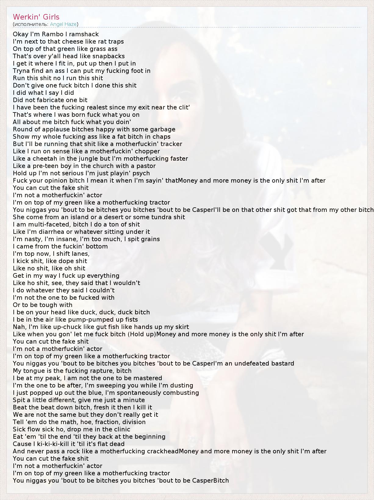 Okay I'm Rambo I ramshack I'm next to that cheese like rat traps On top of that green like grass ass That's over y'all head like snapbacks I get it where I fit in, put up then I put in Tryna find an ass I can put my fucking foot in Run this shit no I run this shit Don't give one fuck bitch I done this shit I did what I say I did Did not fabricate one bit I have been the fucking realest since my exit near the clit' That's where I was born fuck what you on All about me bitch fuck what you doin' Round of applause bitches happy with some garbage Show my whole fucking ass like a fat bitch in chaps But I'll be running that shit like a motherfuckin' tracker Like I run on sense like a motherfuckin' chopper Like a cheetah in the jungle but I'm motherfucking faster Like a pre-teen boy in the church with a pastor Hold up I'm not serious I'm just playin' psych Fuck your opinion bitch I mean it when I'm sayin' thatMoney and more money is the only shit I'm after You can cut the fake shit I'm not a motherfuckin' actor I'm on top of my green like a motherfucking tractor You niggas you 'bout to be bitches you bitches 'bout to be CasperI'll be on that other shit got that from my other bitch She come from an island or a desert or some tundra shit I am multi-faceted, bitch I do a ton of shit Like I'm diarrhea or whatever sitting under it I'm nasty, I'm insane, I'm too much, I spit grains I came from the fuckin' bottom I'm top now, I shift lanes, I kick shit, like dope shit Like no shit, like oh shit Get in my way I fuck up everything Like ho shit, see, they said that I wouldn't I do whatever they said I couldn't I'm not the one to be fucked with Or to be tough with I be on your head like duck, duck, duck bitch I be in the air like pump-pumped up fists Nah, I'm like up-chuck like gut fish like hands up my skirt Like when you gon' let me fuck bitch (Hold up)Money and more money is the only shit I'm after You can cut the fake shit I'm not a motherfuckin' actor I'm on top of my green like a motherfucking tractor You niggas you 'bout to be bitches you bitches 'bout to be CasperI'm an undefeated bastard My tongue is the fucking rapture, bitch I be at my peak, I am not the one to be mastered I'm the one to be after, I'm sweeping you while I'm dusting I just popped up out the blue, I'm spontaneously combusting Spit a little different, give me just a minute Beat the beat down bitch, fresh it then I kill it We are not the same but they don't really get it Tell 'em do the math, hoe, fraction, division Sick flow sick ho, drop me in the clinic Eat 'em 'til the end 'til they back at the beginning Cause I ki-ki-ki-kill it 'til it's flat dead And never pass a rock like a motherfucking crackheadMoney and more money is the only shit I'm after You can cut the fake shit I'm not a motherfuckin' actor I'm on top of my green like a motherfucking tractor You niggas you 'bout to be bitches you bitches 'bout to be CasperBitch