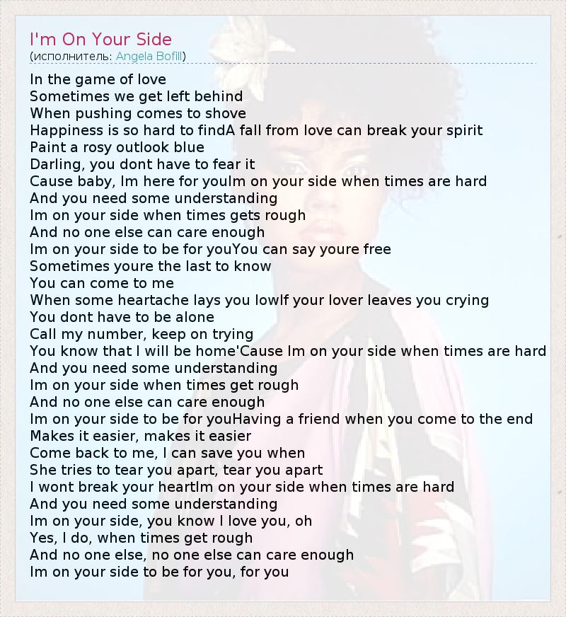 In the game of love Sometimes we get left behind When pushing comes to shove Happiness is so hard to findA fall from love can break your spirit Paint a rosy outlook blue Darling, you dont have to fear it Cause baby, Im here for youIm on your side when times are hard And you need some understanding Im on your side when times gets rough And no one else can care enough Im on your side to be for youYou can say youre free Sometimes youre the last to know You can come to me When some heartache lays you lowIf your lover leaves you crying You dont have to be alone Call my number, keep on trying You know that I will be home'Cause Im on your side when times are hard And you need some understanding Im on your side when times get rough And no one else can care enough Im on your side to be for youHaving a friend when you come to the end Makes it easier, makes it easier Come back to me, I can save you when She tries to tear you apart, tear you apart I wont break your heartIm on your side when times are hard And you need some understanding Im on your side, you know I love you, oh Yes, I do, when times get rough And no one else, no one else can care enough Im on your side to be for you, for you
