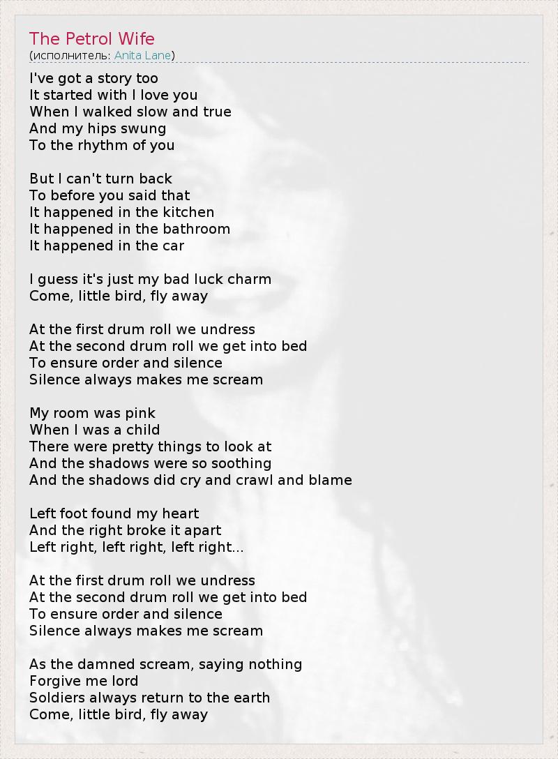 I've got a story too It started with I love you When I walked slow and true And my hips swung To the rhythm of you But I can't turn back To before you said that It happened in the kitchen It happened in the bathroom It happened in the car I guess it's just my bad luck charm Come, little bird, fly away At the first drum roll we undress At the second drum roll we get into bed To ensure order and silence Silence always makes me scream My room was pink When I was a child There were pretty things to look at And the shadows were so soothing And the shadows did cry and crawl and blame Left foot found my heart And the right broke it apart Left right, left right, left right... At the first drum roll we undress At the second drum roll we get into bed To ensure order and silence Silence always makes me scream As the damned scream, saying nothing Forgive me lord Soldiers always return to the earth Come, little bird, fly away