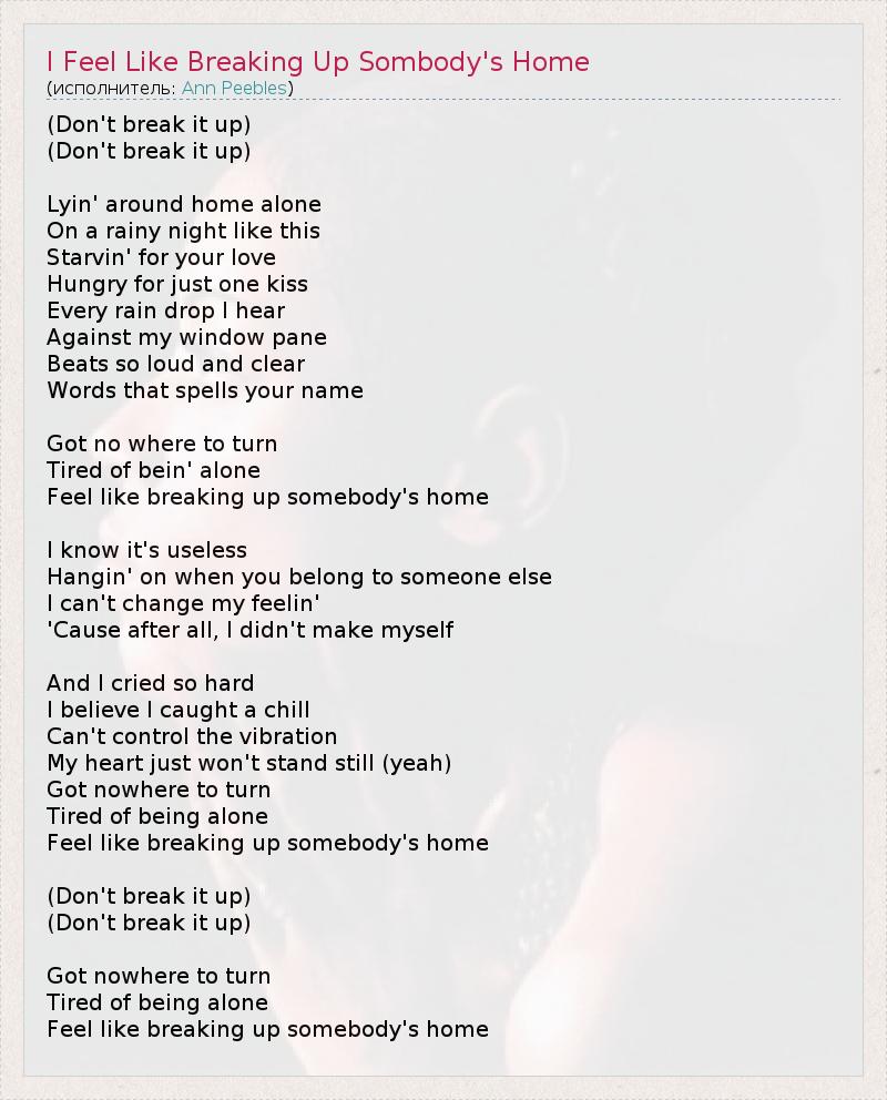(Don't break it up) (Don't break it up) Lyin' around home alone On a rainy night like this Starvin' for your love Hungry for just one kiss Every rain drop I hear Against my window pane Beats so loud and clear Words that spells your name Got no where to turn Tired of bein' alone Feel like breaking up somebody's home I know it's useless Hangin' on when you belong to someone else I can't change my feelin' 'Cause after all, I didn't make myself And I cried so hard I believe I caught a chill Can't control the vibration My heart just won't stand still (yeah) Got nowhere to turn Tired of being alone Feel like breaking up somebody's home (Don't break it up) (Don't break it up) Got nowhere to turn Tired of being alone Feel like breaking up somebody's home